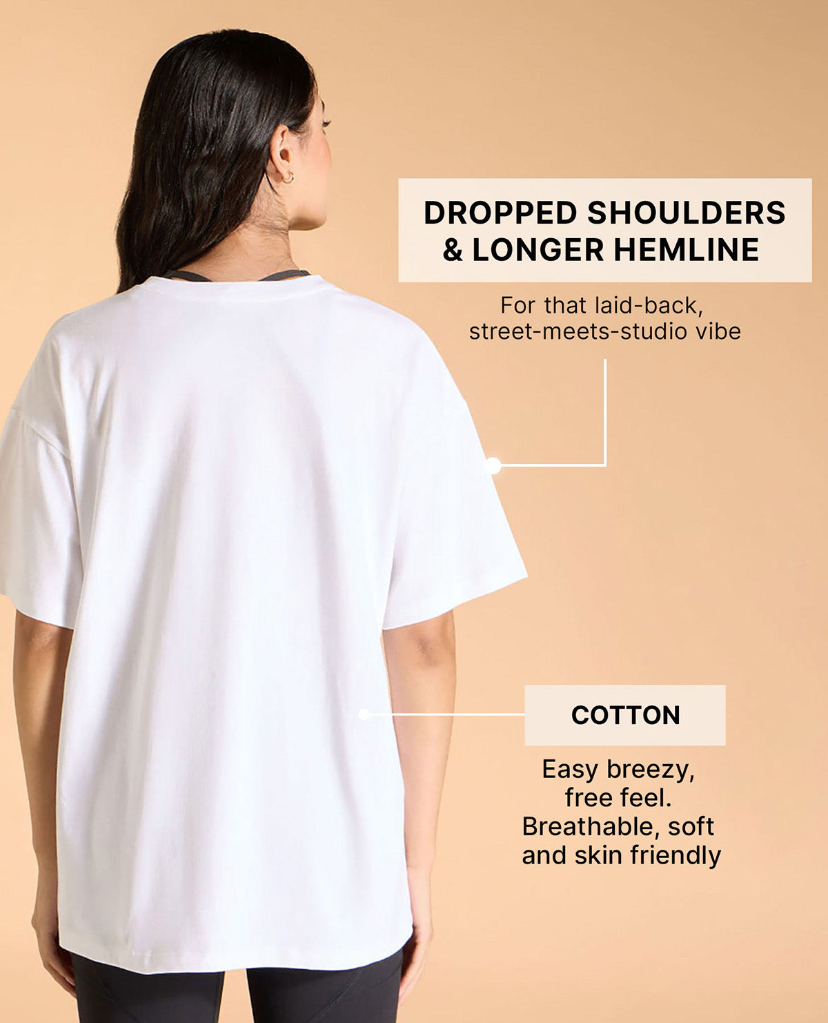 The Cotton Oversized tee is your everyday staple for movement and ease. Designed in 100% premium cotton with an extra-soft finish, this oversized t-shirt for women is breathable, lightweight, and designed for all-day comfort. Whether you’re lounging, layering, or out on the move, it’s the effortless throw-on you’ll reach for again and again.
