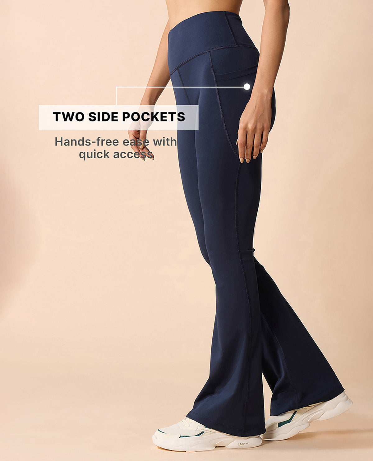 A: Our Flare Pants come in two fabric options: Second SKN fabric, known for its moisture-wicking and quick-drying properties, and a cotton+lycra blend for a soft and comfortable feel.