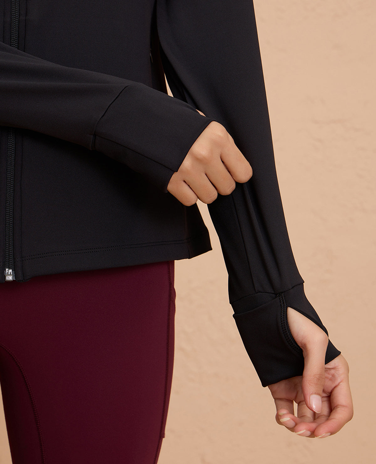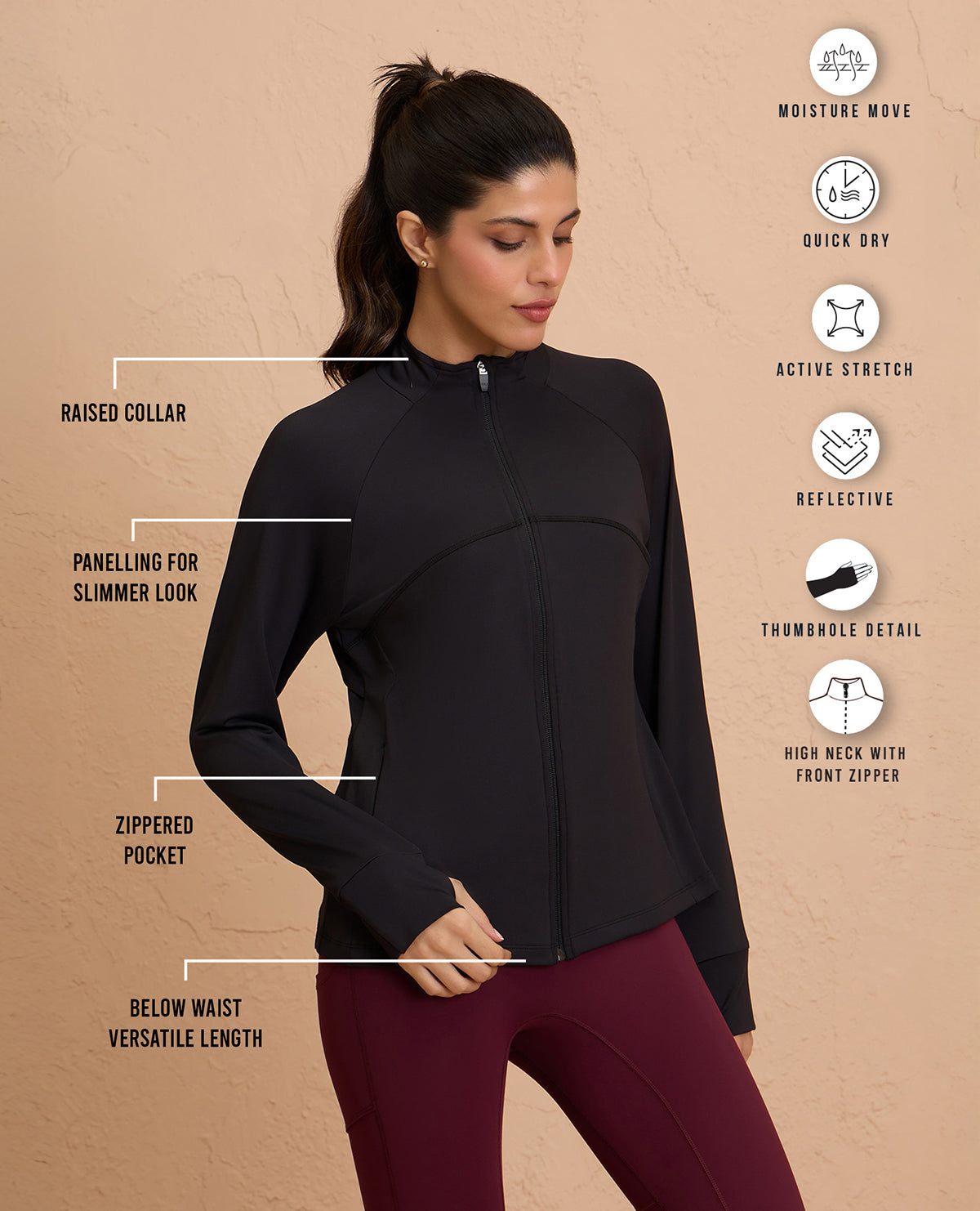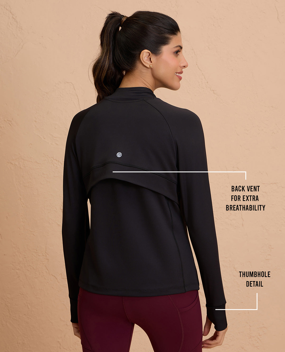 It features a front zippered closure, concealed pockets, and thumbholes to keep the sleeves in place - making it the most functional jacket in your wardrobe. Crafted with a super stretchy four-way stretch, sweat-wicking, and breathable fabric, this jacket is your ideal companion for any activity. A functional vent at back ensures you stay dry, feeling fresh throughout!