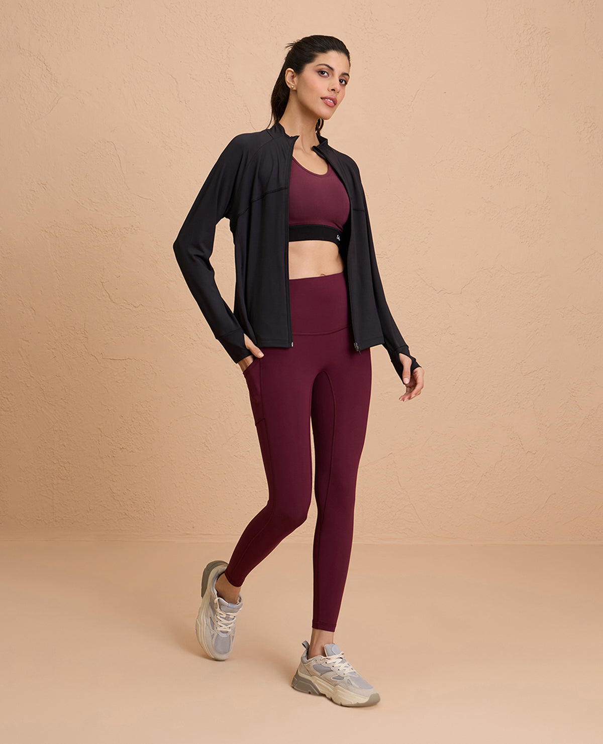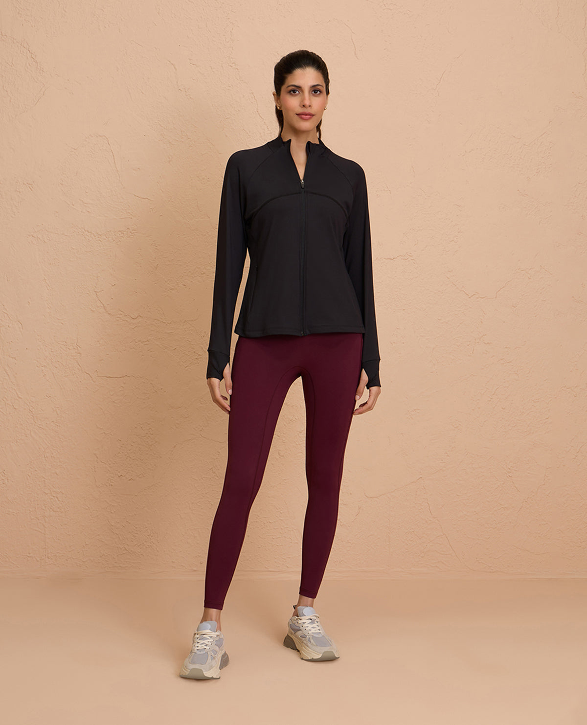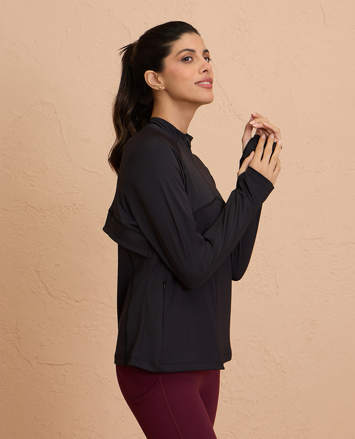 It features a front zippered closure, concealed pockets, and thumbholes to keep the sleeves in place - making it the most functional jacket in your wardrobe. Crafted with a super stretchy four-way stretch, sweat-wicking, and breathable fabric, this jacket is your ideal companion for any activity. A functional vent at back ensures you stay dry, feeling fresh throughout!