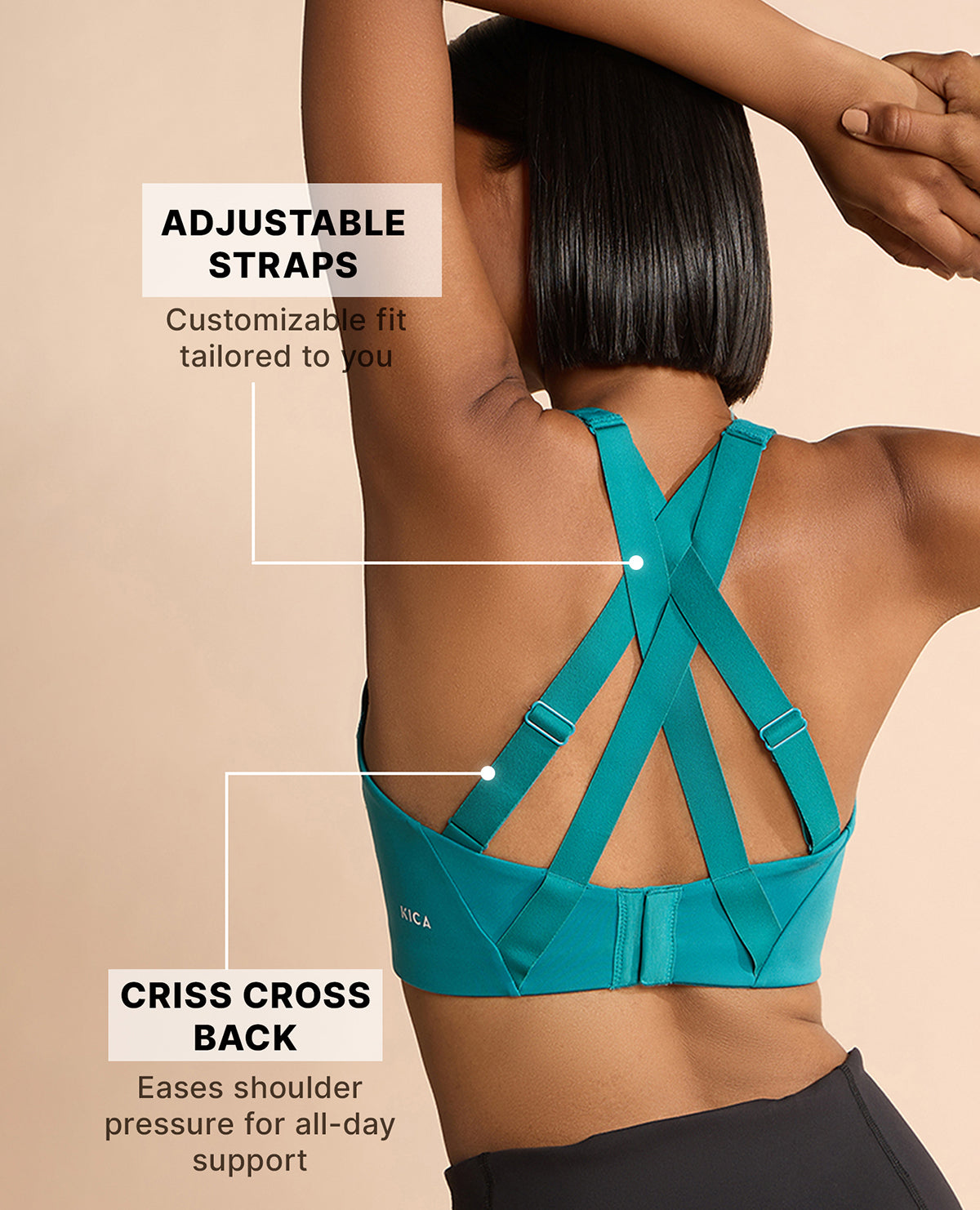 A: Kica sports bras are designed with features to ensure maximum support and comfort. Look for adjustable straps that allow you to customize the fit and find the right level of support for your body. Wide, padded shoulder straps help distribute weight and reduce pressure on your shoulders. Our sports bras also feature a supportive underband and encapsulated cups for excellent support and shape. Additionally, moisture-wicking and breathable fabrics are incorporated to keep you cool and dry during your workouts.