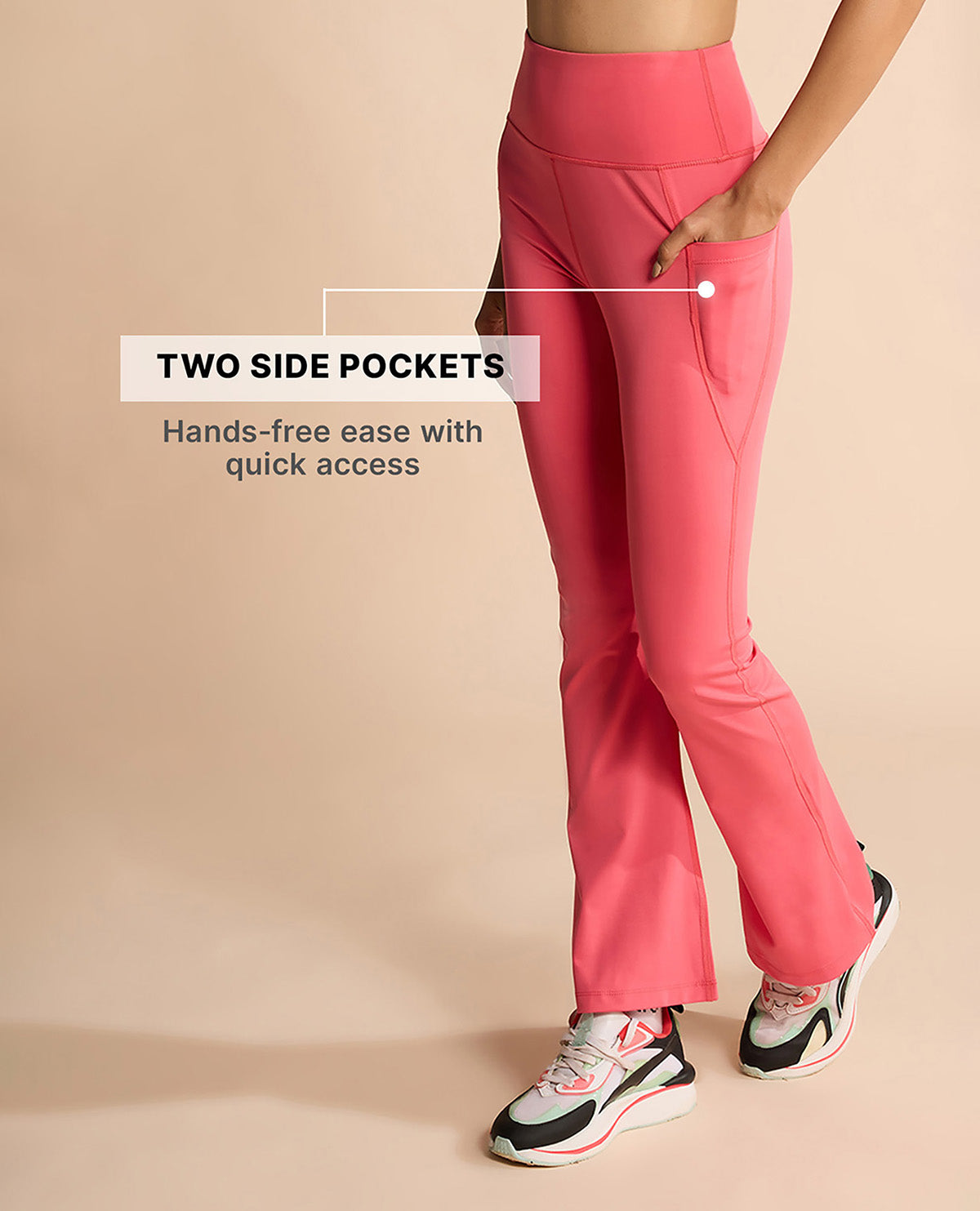 A: Our Flare Pants come in two fabric options: Second SKN fabric, known for its moisture-wicking and quick-drying properties, and a cotton+lycra blend for a soft and comfortable feel.