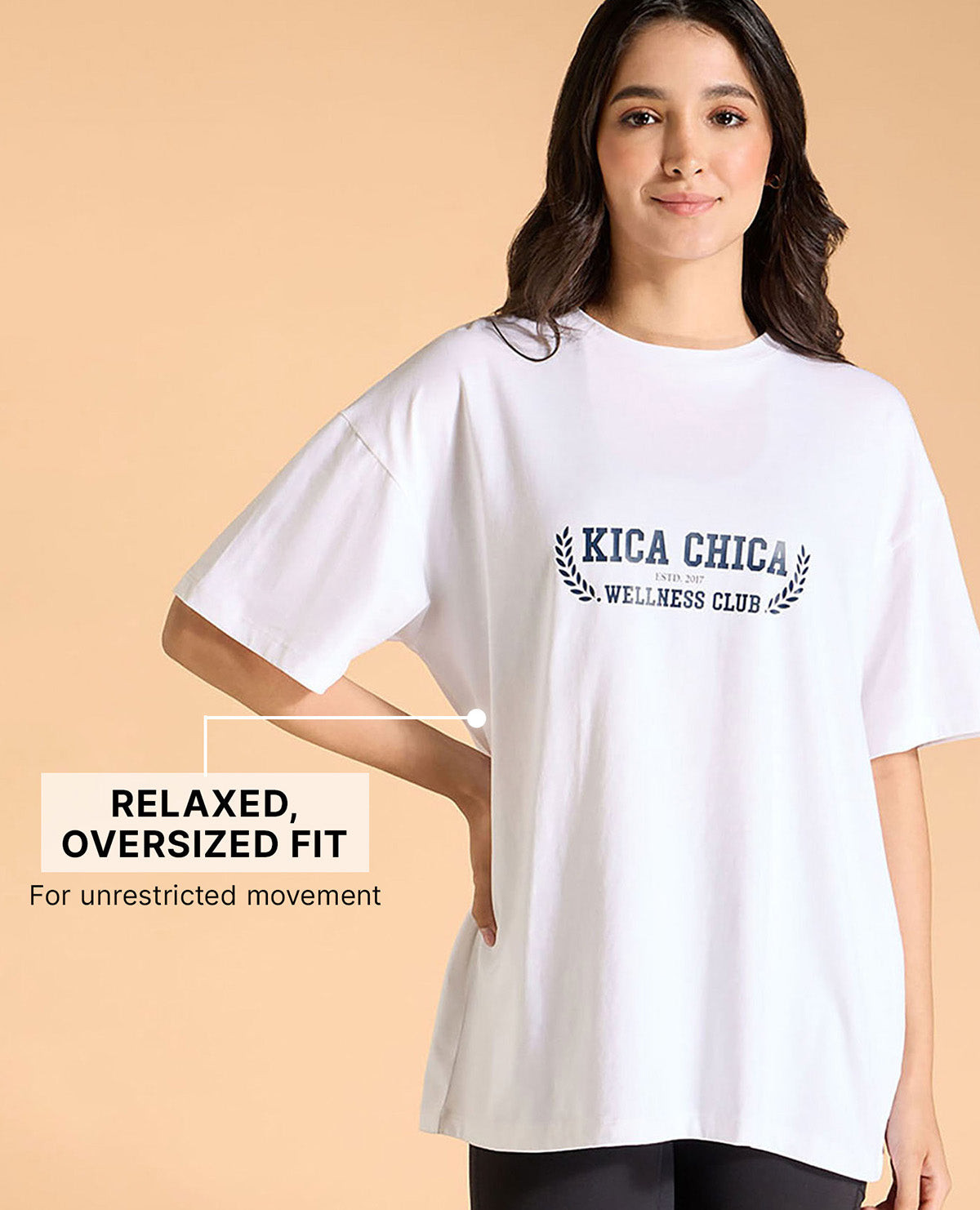 "Meet your new off-duty essential: the Cotton Oversized T-Shirt. Designed in 100% premium cotton and finished for an extra-soft feel, this oversized t-shirt for women is breathable, lightweight, and made for all-day comfort. Whether you’re lounging, layering, or lifting, it’s the easy throw-on you’ll reach for again and again. Why you’ll love it: * Relaxed oversized fit that keeps you airy and unrestricted * Hip-covering length for flattering drape and extra coverage * Soft cotton fabric that feels as good as it looks * Round neck and graphic print for effortless style * Works with everything: leggings, jeans, or shorts Made from 100% Cotton with a luxe gold finish treatment, the Cotton Oversized T-Shirt is your versatile everyday essential. From yoga sessions to coffee runs to weekend lounging, this oversized tee for women moves with you everywhere."