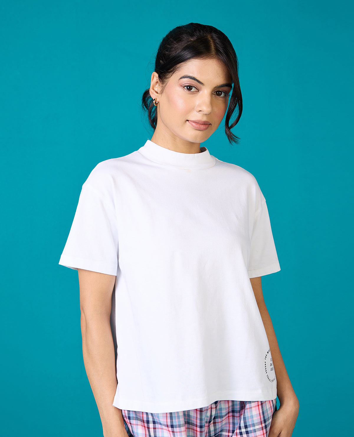Crafted with raised neckline and rib detailing, high low hem with mindful graphic, it's a wardrobe essential you can't miss.