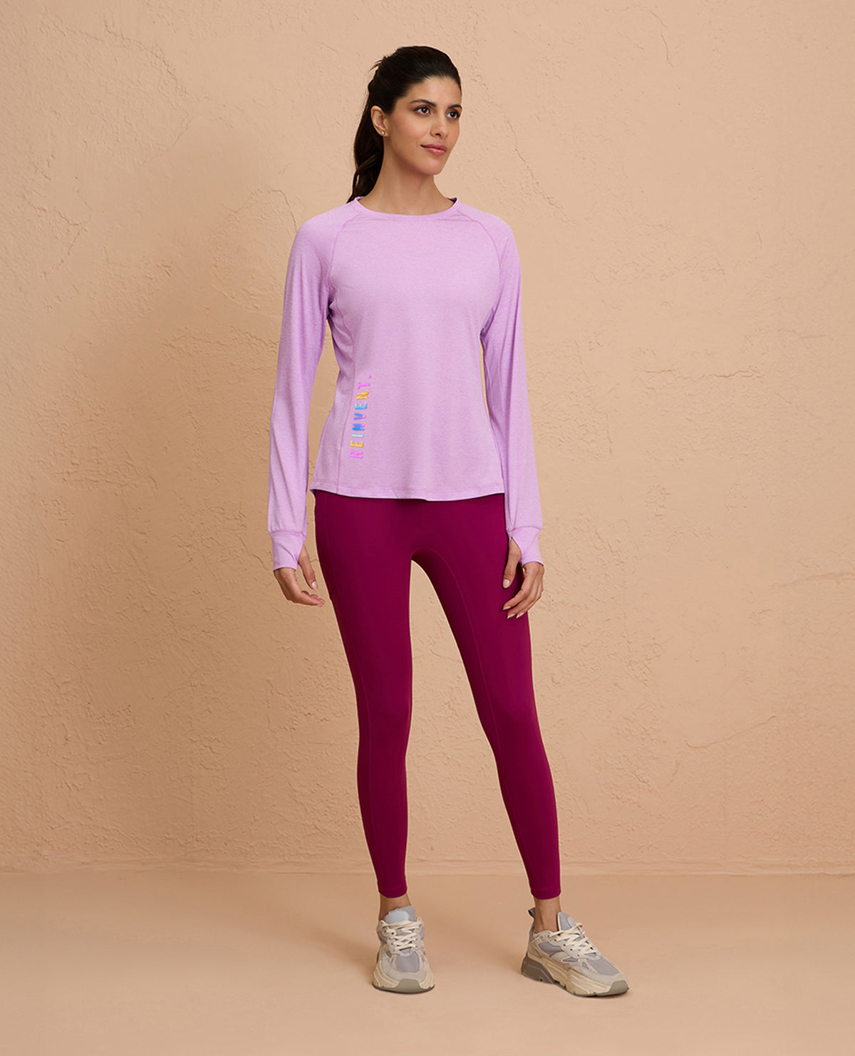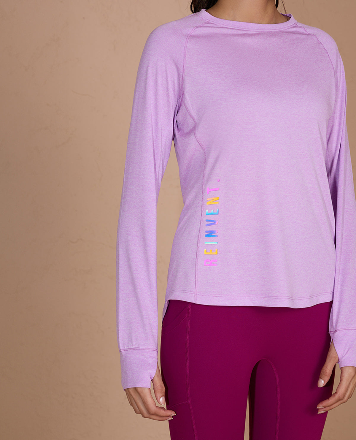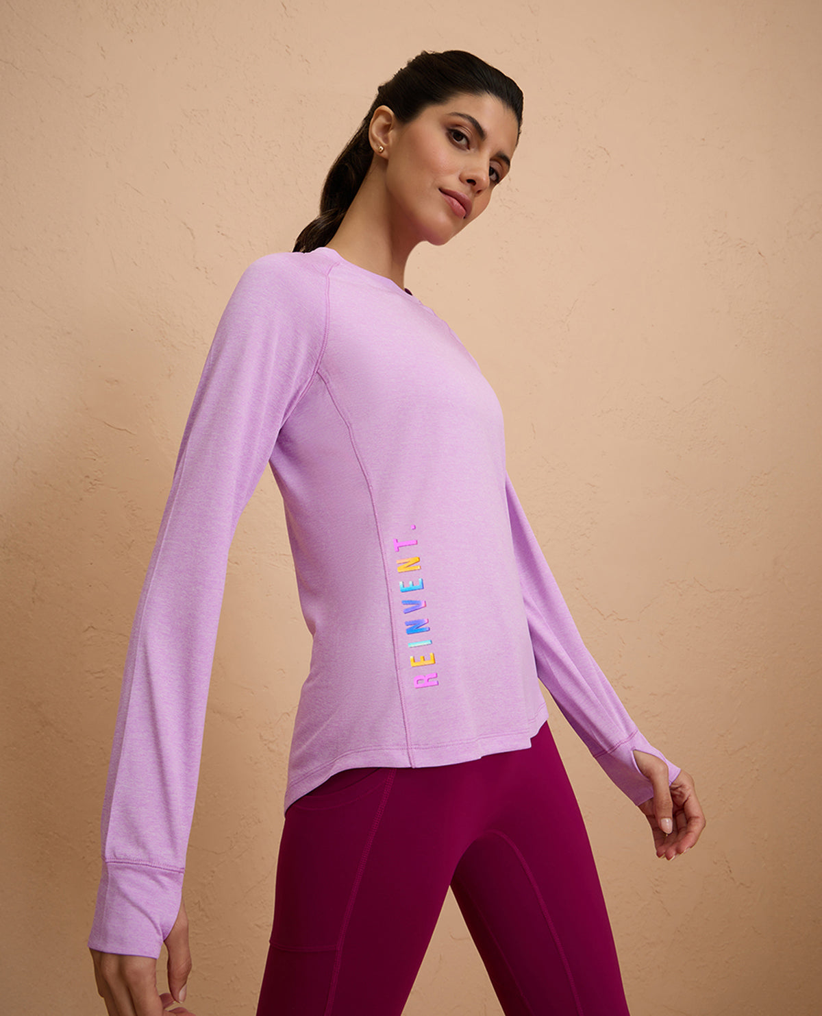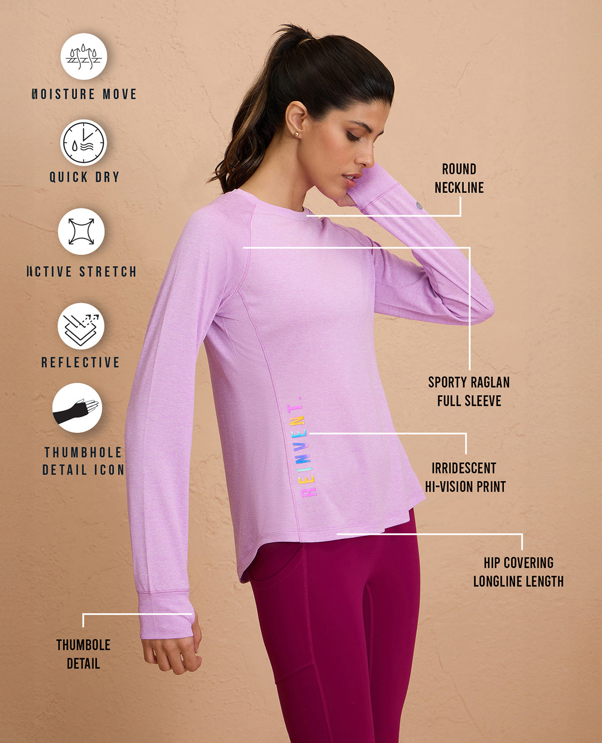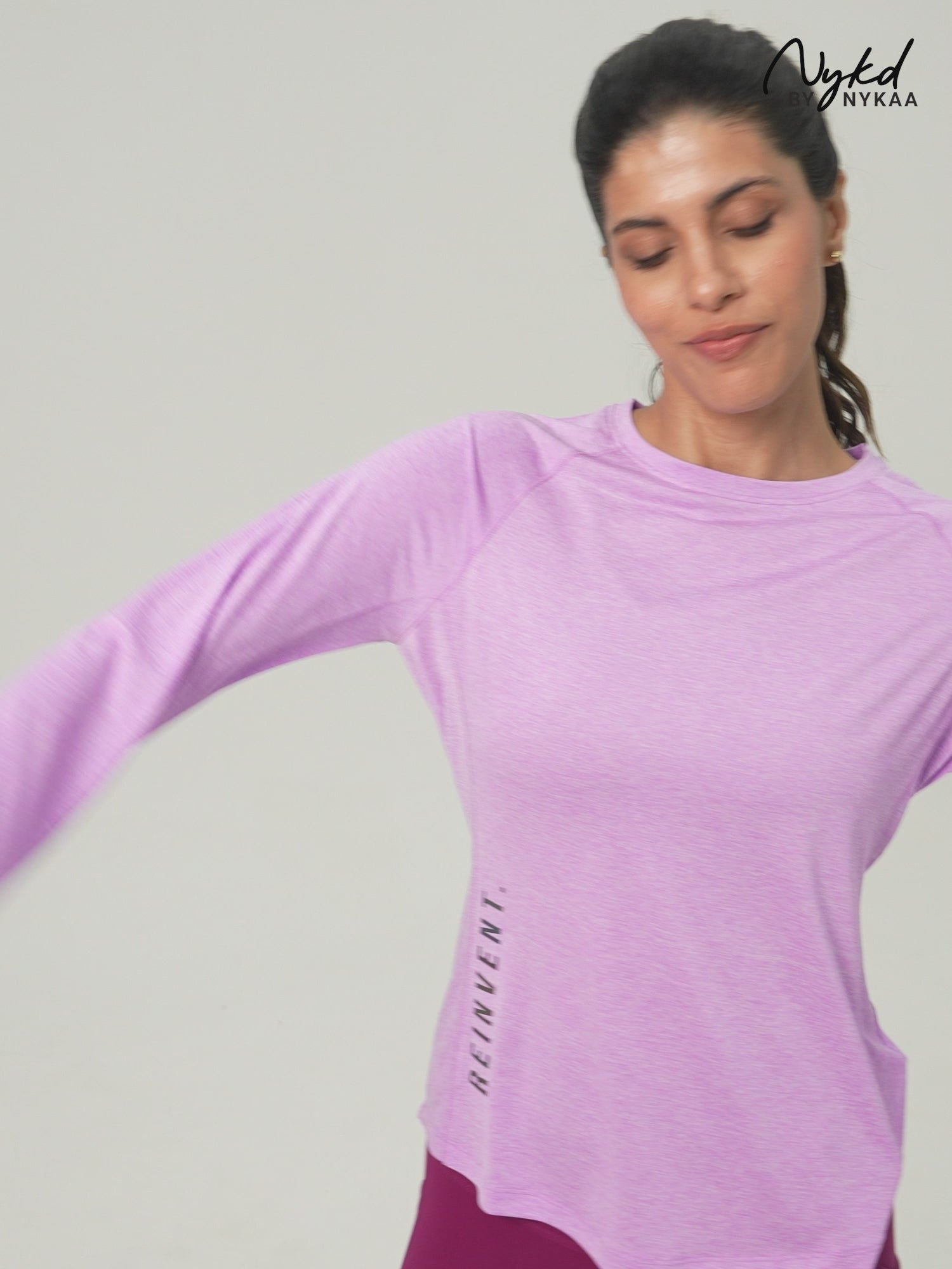 Introducing the Long-Sleeved Athletic Top: Your ultimate companion for running or walking, featuring ergonomic design with raglan  sleeves and thumb-hole detail. Stay dry and comfortable with quick-drying, fabric that keeps you cool throughout your workout.    Know your Nykd All Day Product :   100% Poly Quick dry, lightweight, Melange Texture Fabric Relaxed fit for all-day comfort with round neckline Flattering Apple bottom, hip covering length Raglan Full sleeves with thumbhole detail Reflective Iridescent Graphic for night vision