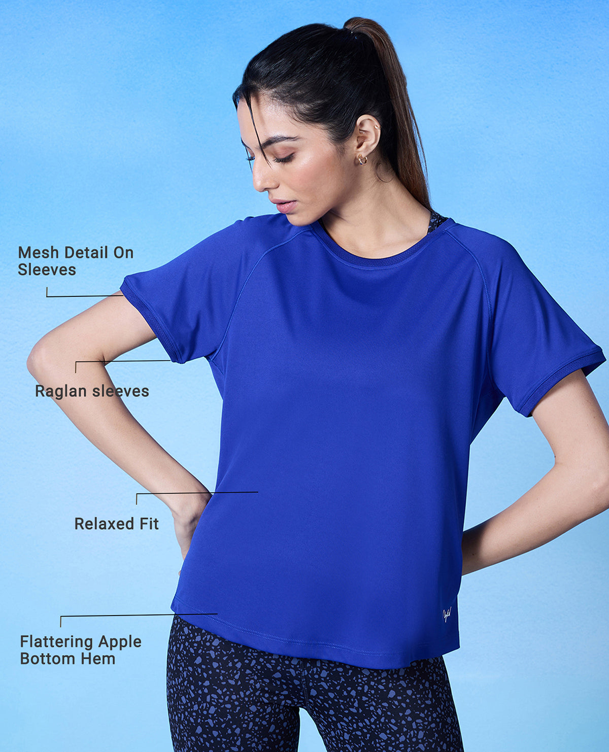 Details: Soft mesh at the neckline and sleeve hem for an elevated look.