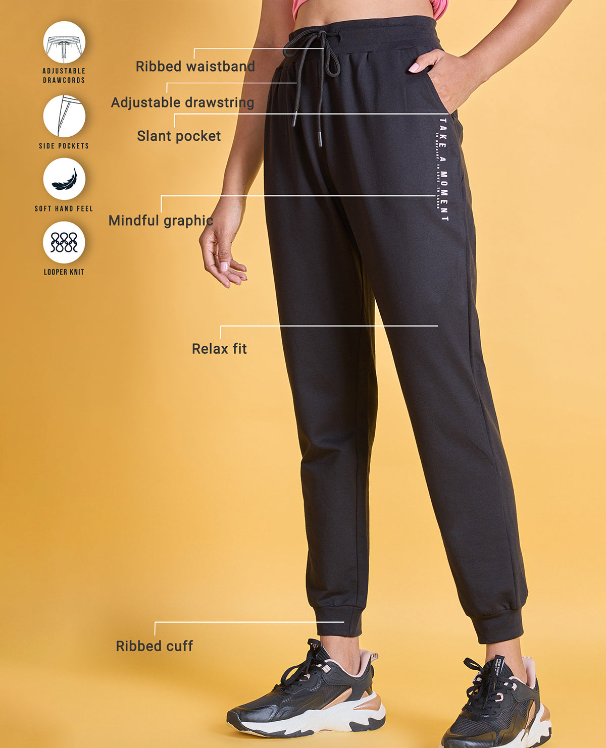 With ribbed detailing at waistband and cuff, mindful graphic print in left and a relaxed fit, you can't have just one.