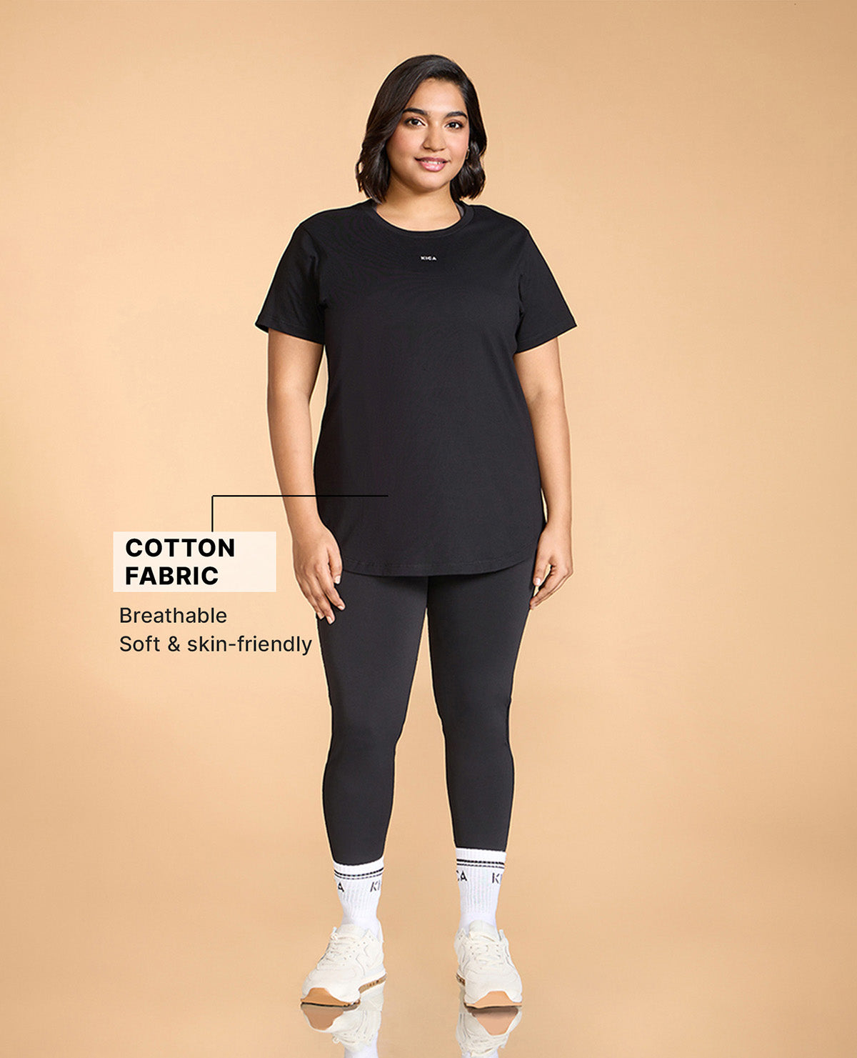 * Comfort-first fit: Regular silhouette with hip-covering length and half sleeves