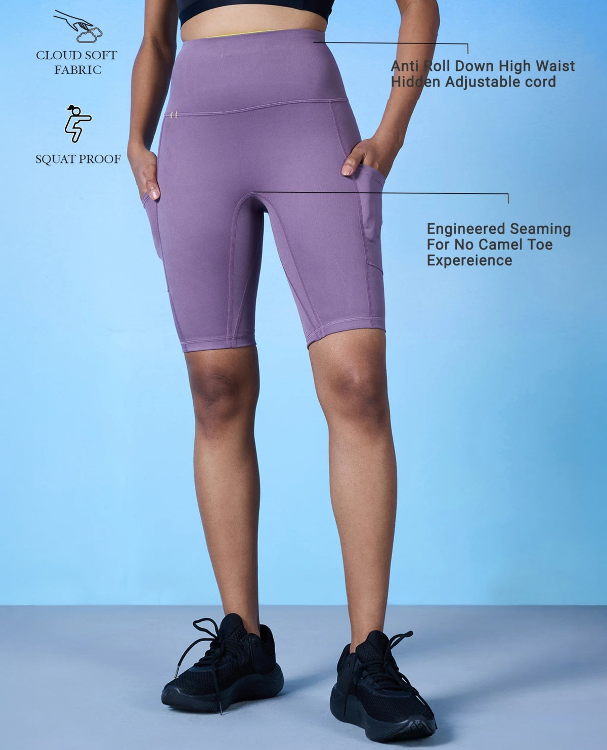 Features: Side Pockets on both sides, anti- camel toe and squat proof Relaxed fit that ends at above knee length.