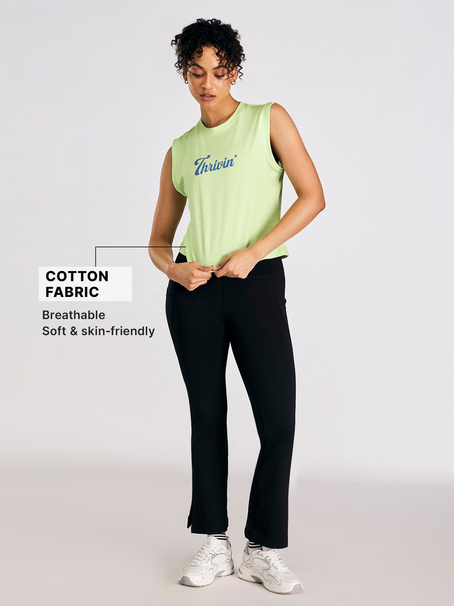 Elevate your essentials with this Women’s Cotton Muscle Tank Top, crafted from 100% soft, breathable cotton for all-day comfort. The muscle tank silhouette allows for relaxed arm movement, while the ribbed neckline adds a clean, structured finish.Featuring a bold chest print, this sleeveless top brings a sporty edge to any look.