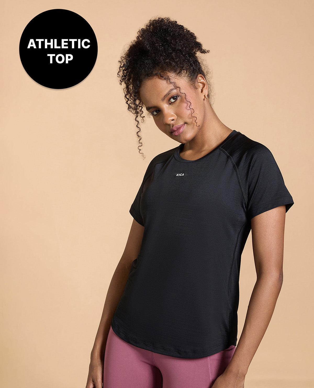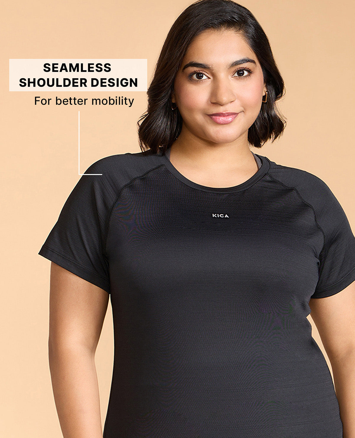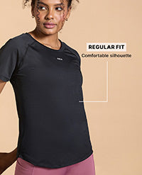 "The Basic Training Top is your go-to workout t-shirt for women - no fuss, just performance. Designed in soft, breathable fabric, this gym top keeps you cool, comfy, and focused whether you’re hitting the weights or flowing through yoga. Why you’ll love it: * Classic round neck for an easy, versatile fit * Raglan sleeves for free and natural movement * Half sleeves and regular length for everyday wearability * Breathable textured fabric that keeps sweat in check * Regular fit that works for workouts and beyond Crafted in a textured blend of 92% Polyester and 8% Spandex, the Basic Training Top delivers comfort, stretch, and durability. From lifting to lounging, this women’s gym top is built to keep up with your every move."