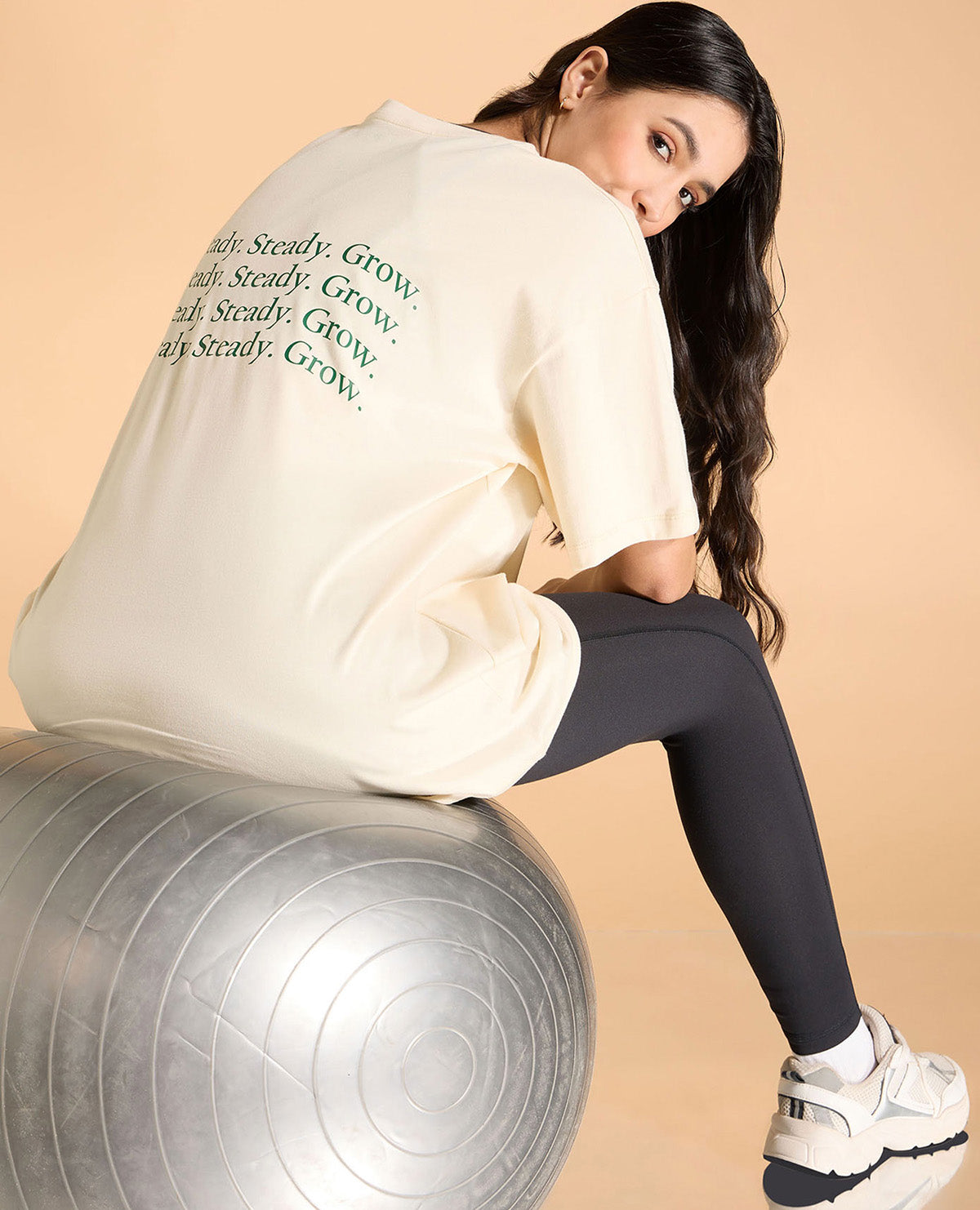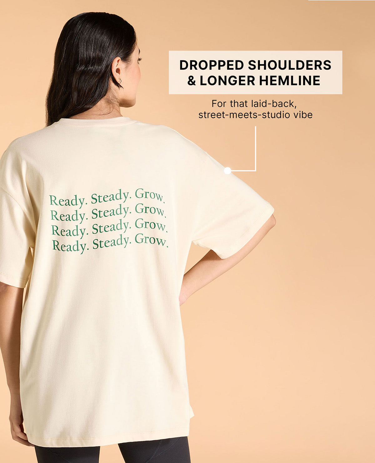 "Meet your new off-duty essential: the Cotton Oversized T-Shirt. Designed in 100% premium cotton and finished for an extra-soft feel, this oversized t-shirt for women is breathable, lightweight, and made for all-day comfort. Whether you’re lounging, layering, or lifting, it’s the easy throw-on you’ll reach for again and again. Why you’ll love it: * Relaxed oversized fit that keeps you airy and unrestricted * Hip-covering length for flattering drape and extra coverage * Soft cotton fabric that feels as good as it looks * Round neck and graphic print for effortless style * Works with everything: leggings, jeans, or shorts Made from 100% Cotton with a luxe gold finish treatment, the Cotton Oversized T-Shirt is your versatile everyday essential. From yoga sessions to coffee runs to weekend lounging, this oversized tee for women moves with you everywhere."