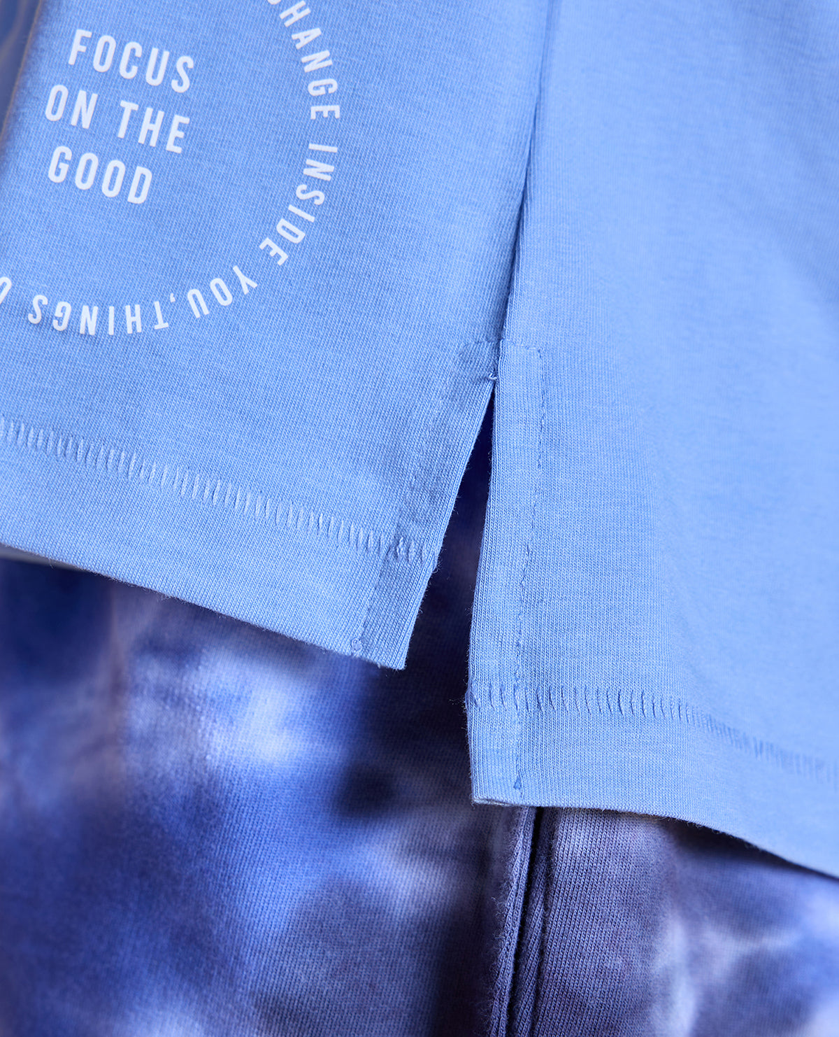 Detail: High low hem with slit, mindful graphic detailing with a relaxed fit