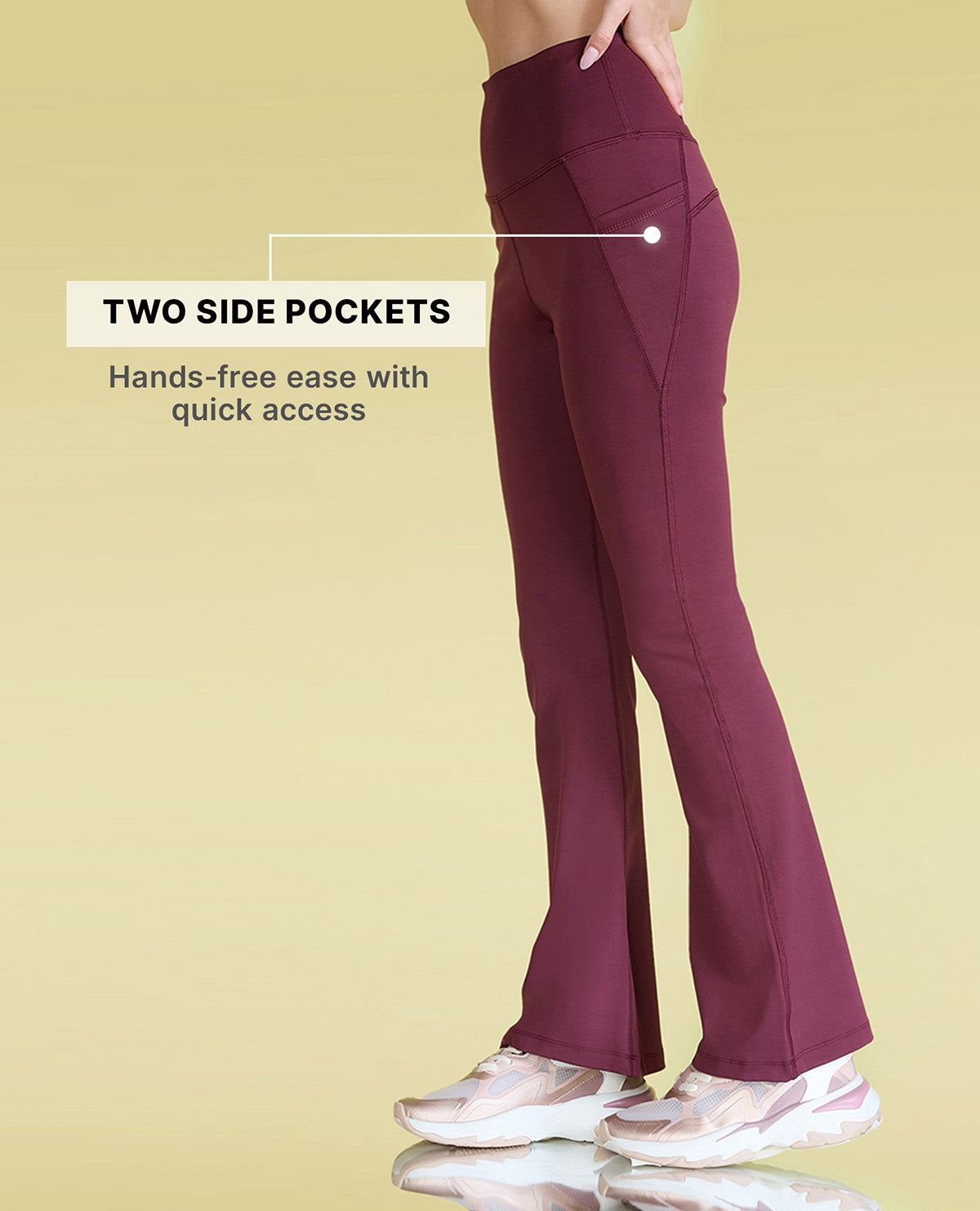 A: Our Flare Pants come in two fabric options: Second SKN fabric, known for its moisture-wicking and quick-drying properties, and a cotton+lycra blend for a soft and comfortable feel.