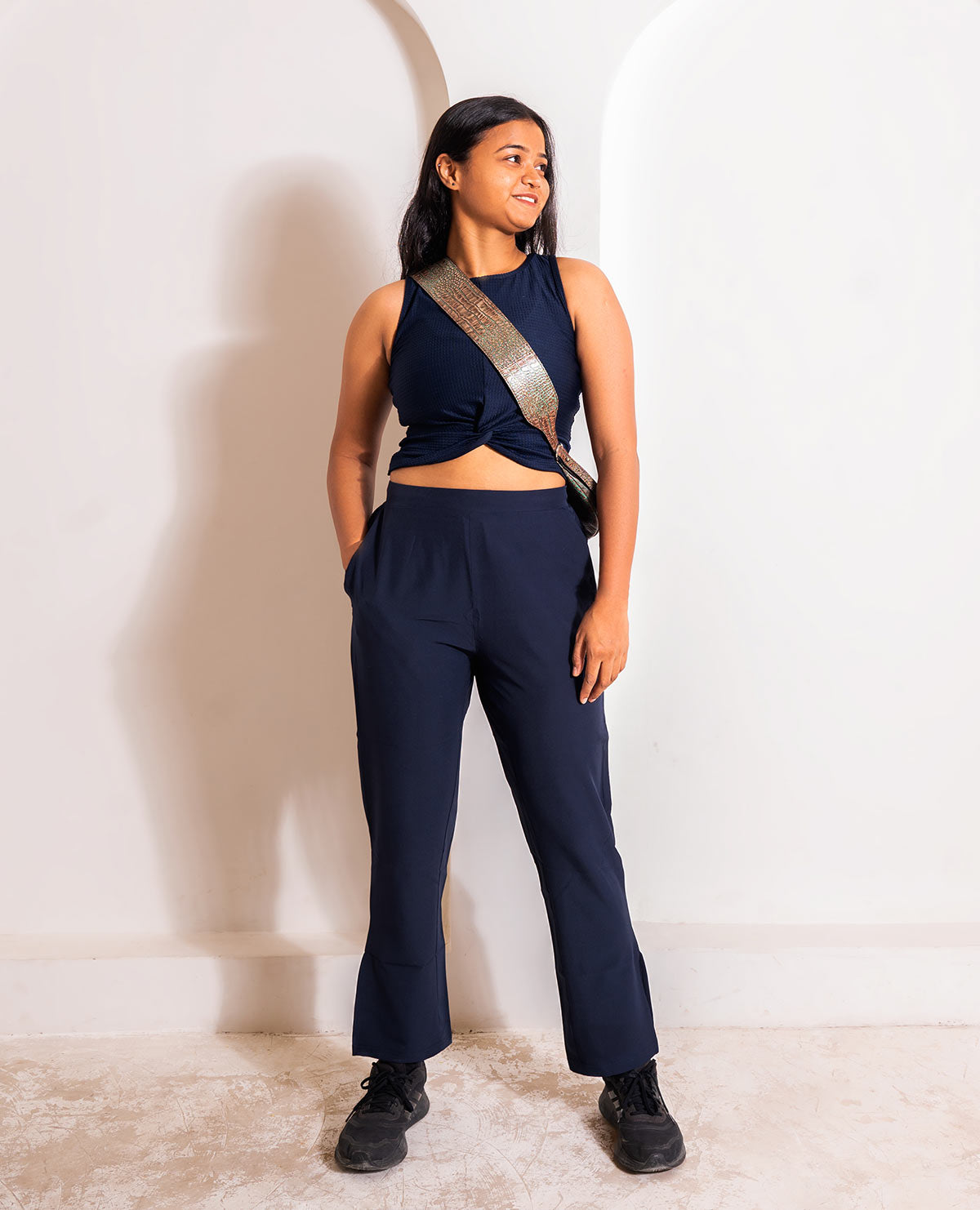 Serious pant goals. The Max Dry Travel pants are made from a Nylon Spandex blend, which means it's super lightweight, woven, and has a loose, straight-leg silhouette, side pockets, and slits at the ankle. Pair it with a blazer and cute statement bra or crop top. The perfect stylish, easy-to-pair with, pair of pants.