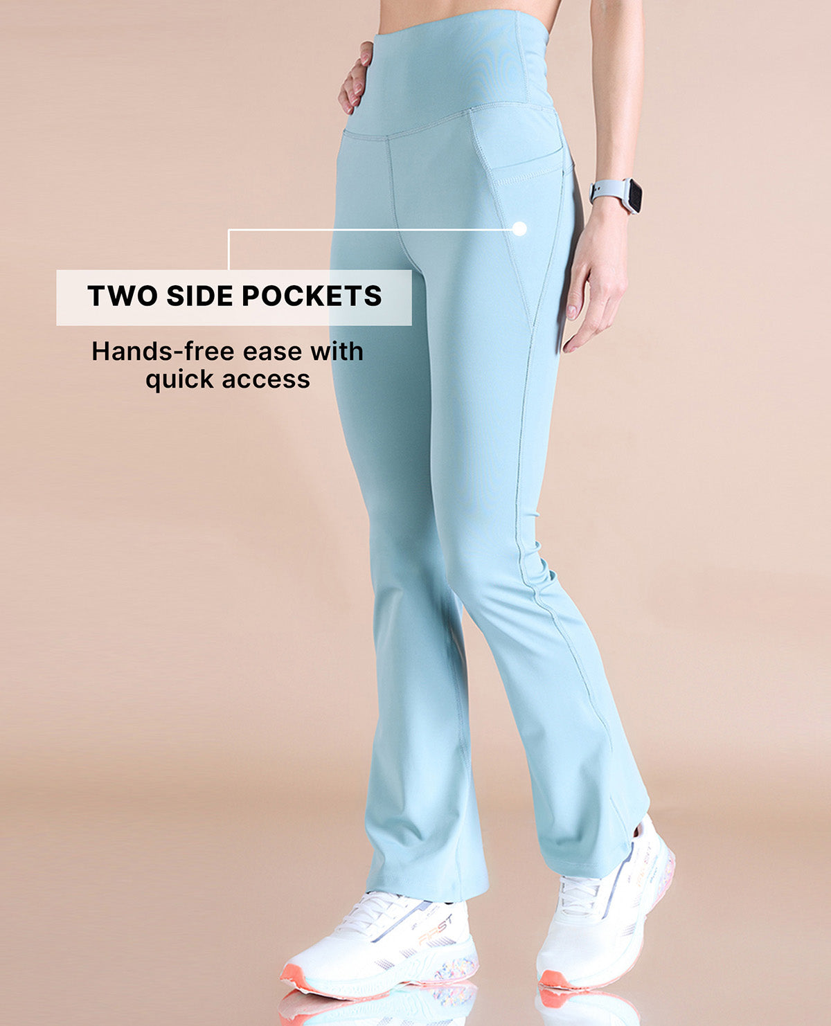 "Meet our bestselling Flare Pants for women, crafted in the cult-favourite Second SKN fabric that hugs your curves, shapes beautifully, and feels like a second skin. Breathable, quick-drying, and completely opaque, these women’s flare yoga pants are built to move with you, sweat-free. Why you’ll love them: * Stay-put fit: High-rise waistband that doesn’t roll or slip, even during your deepest squats. * All-day comfort: Soft elastic sits smoothly at your waist, no digging, no marks. * Zero awkward moments: Anti-camel toe and squat-proof construction keep you confident at the gym. * Flattering by design: Bootcut silhouette that elongates your legs and lifts your curves. * Functional details: Two side pockets to stash your essentials while you’re on the move. Made in our signature Second SKN blend (88% Polyester, 12% Elastane) for a snug-yet-stretchy fit, these flare leggings for women work as hard as you do. From work to workout to weekend plans, the Flare Pants are your versatile, all-day-anywhere essential, the perfect pair of stylish yoga pants for women."