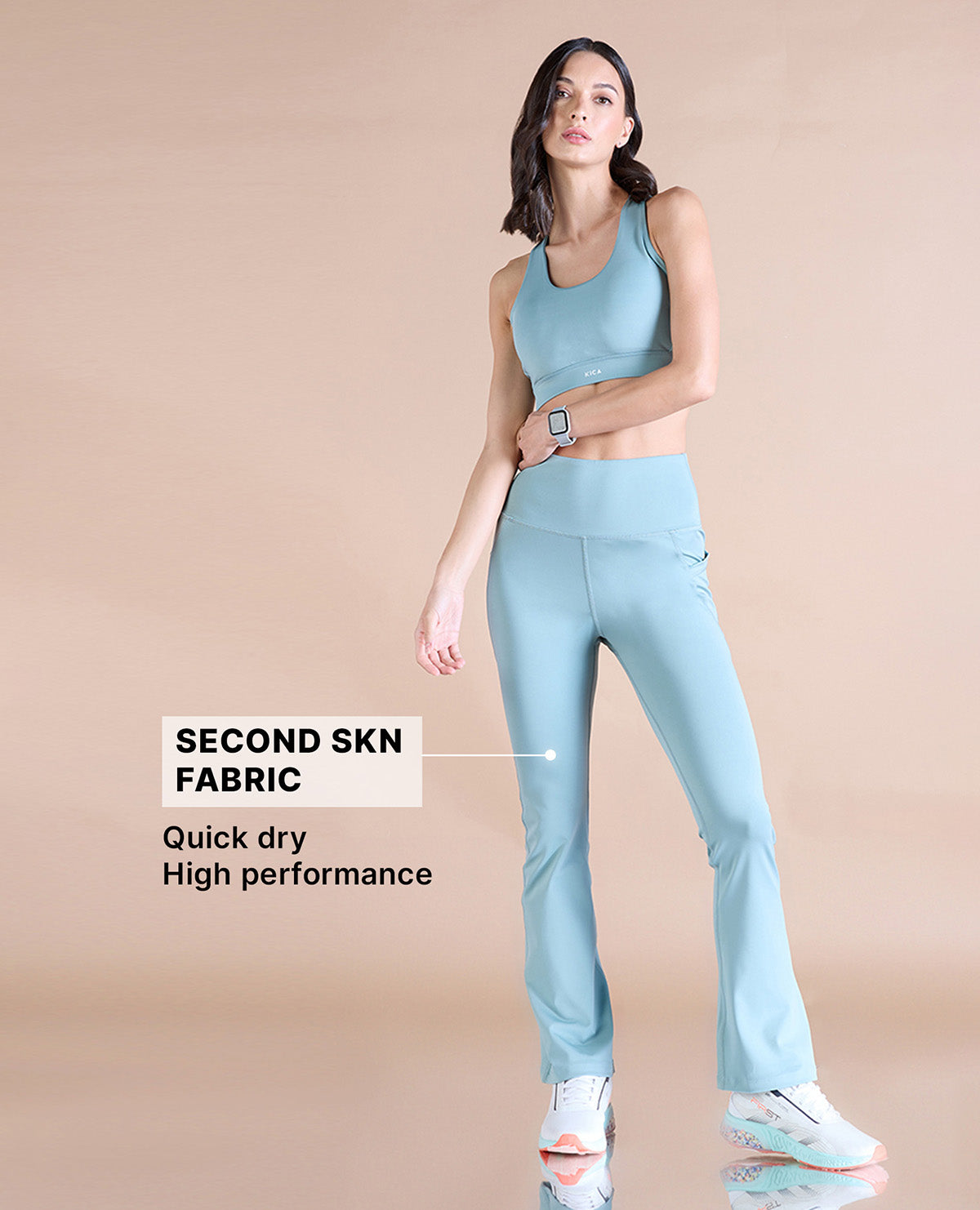 A: Our Flare Pants come in two fabric options: Second SKN fabric, known for its moisture-wicking and quick-drying properties, and a cotton+lycra blend for a soft and comfortable feel.
