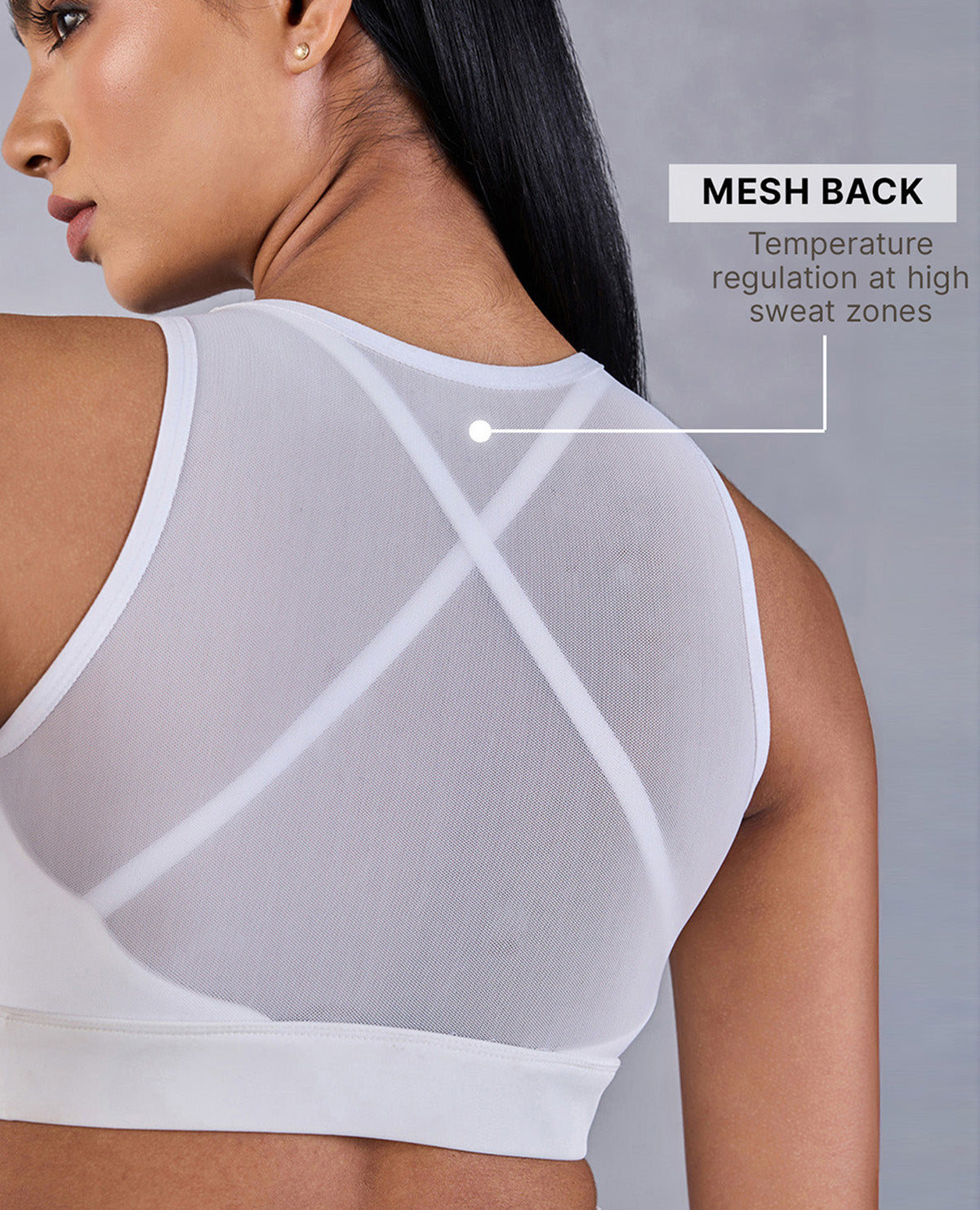 "The Mesh Sports Bra is your go-to high-impact sports bra for women that doesn’t compromise on style or comfort. Crafted in our cult-favourite Second SKN fabric, this lightweight, breathable, gym sports bra for women is stretchable, quick-drying, and keeps you sweat-free and confident from start to finish. Why you’ll love it: * Maximum support: Perfect for gym sessions, running, dance, or yoga flows, keeps you secure in every move, making it one of the best sports bras for women. * Custom comfort: Adjustable straps let you find your perfect fit for padded or non-padded sports bra needs. * Stay-dry tech: Mesh back ensures breathability and keeps you cool even during the sweatiest workouts. * Edgy style: V-neck design adds a chic, sporty edge, perfect as a stylish sports bra for women. * Versatile wear: Removable cups let you wear it your way, gym-ready or styled as a crop top bra for women. Made in our signature Second SKN blend (88% Polyester, 12% Spandex) with breathable Nylon-Spandex mesh (92% Nylon, 8% Spandex), the Mesh Sports Bra delivers a snug-yet-stretchy fit that works as hard as you do. From high-intensity sessions to weekend street style, the Mesh Sports Bra is your versatile, all-day-anywhere essential, ideal for women’s workouts and gym sessions."