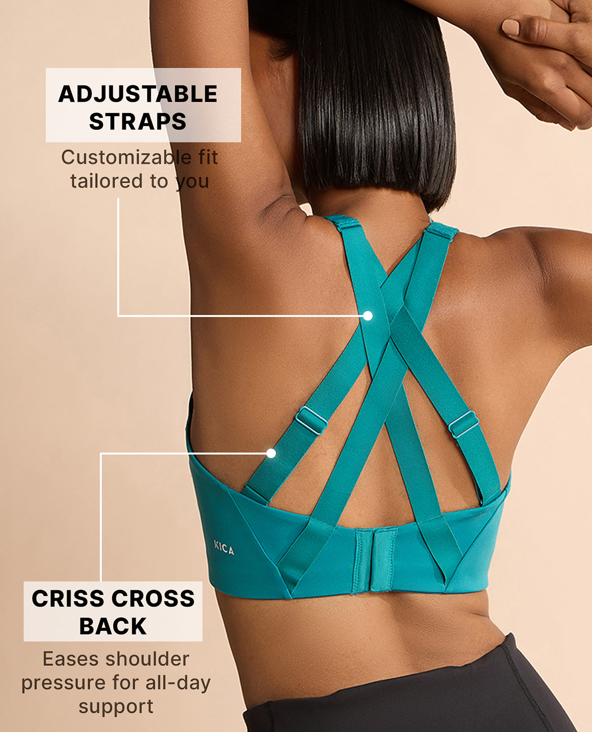 A: Kica sports bras are designed with features to ensure maximum support and comfort. Look for adjustable straps that allow you to customize the fit and find the right level of support for your body. Wide, padded shoulder straps help distribute weight and reduce pressure on your shoulders. Our sports bras also feature a supportive underband and encapsulated cups for excellent support and shape. Additionally, moisture-wicking and breathable fabrics are incorporated to keep you cool and dry during your workouts.