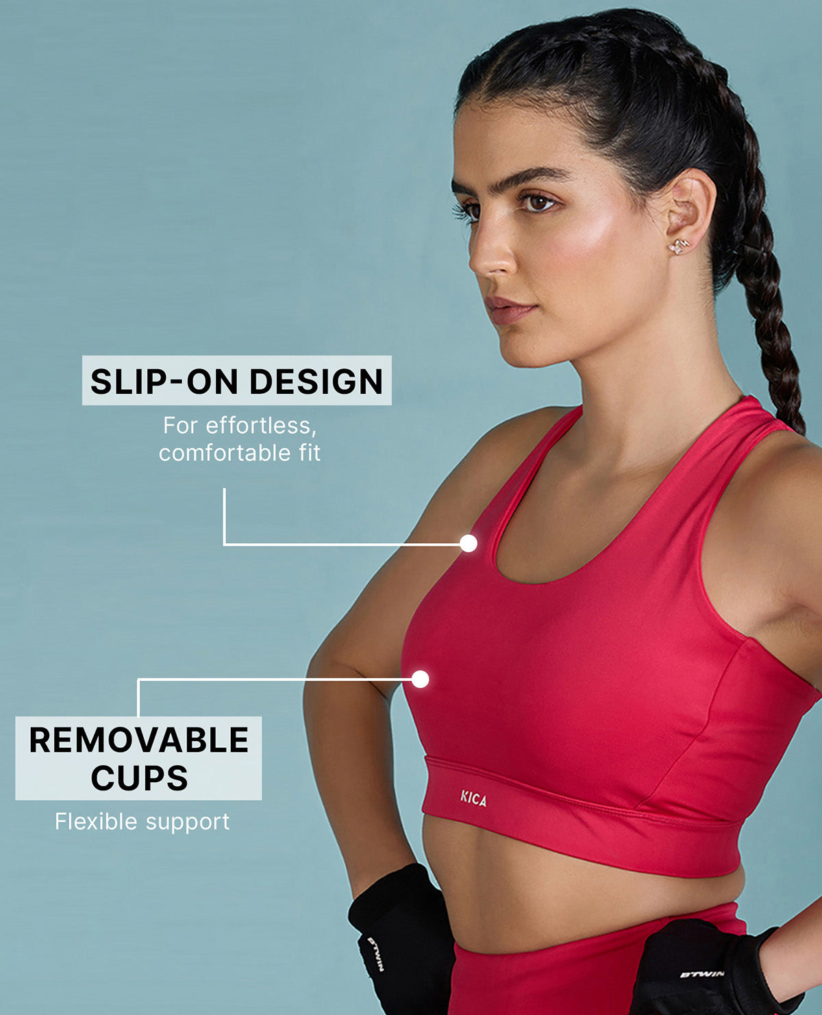 A: Kica sports bras are designed with features to ensure maximum support and comfort. Look for adjustable straps that allow you to customize the fit and find the right level of support for your body. Wide, padded shoulder straps help distribute weight and reduce pressure on your shoulders. Our sports bras also feature a supportive underband and encapsulated cups for excellent support and shape. Additionally, moisture-wicking and breathable fabrics are incorporated to keep you cool and dry during your workouts.