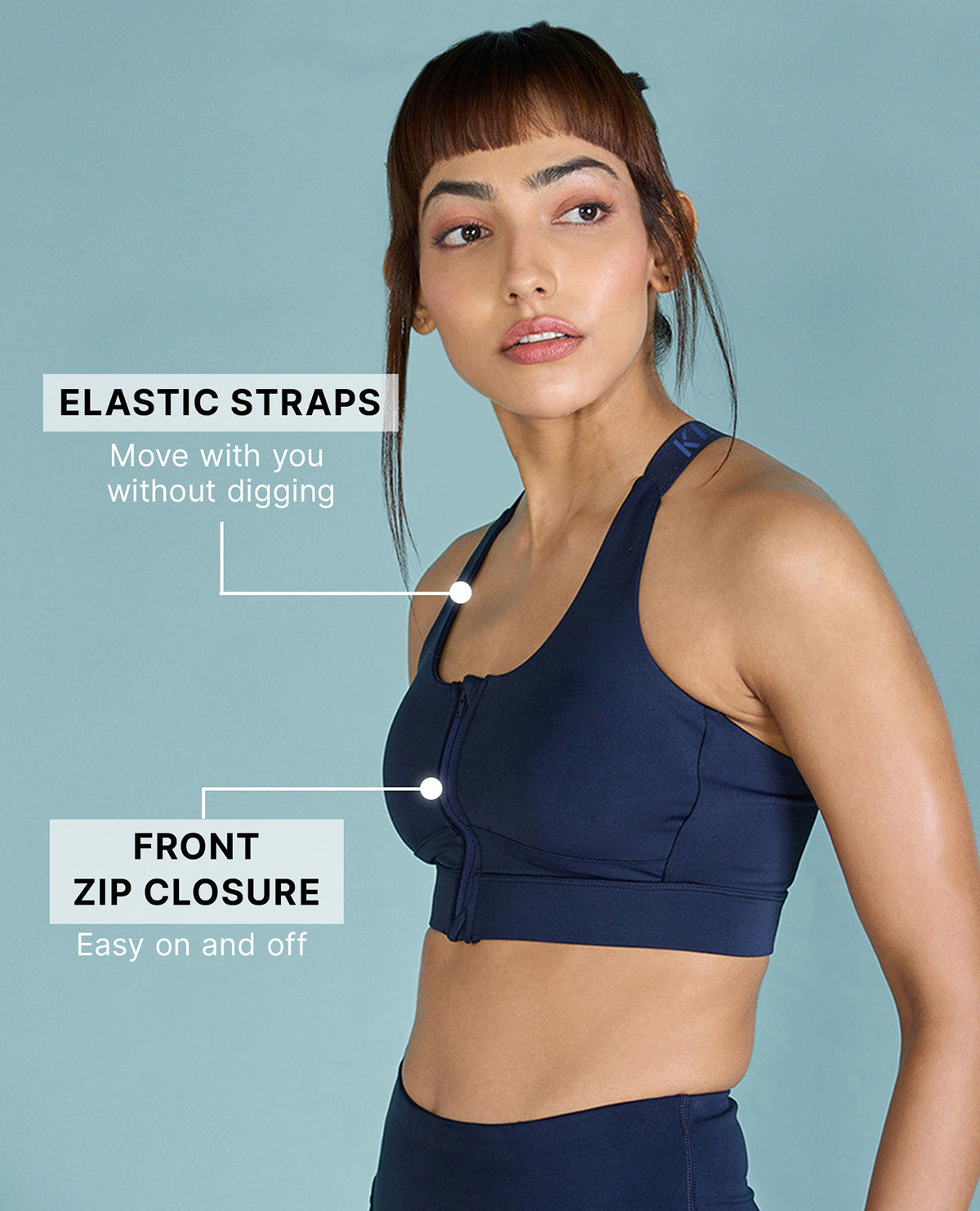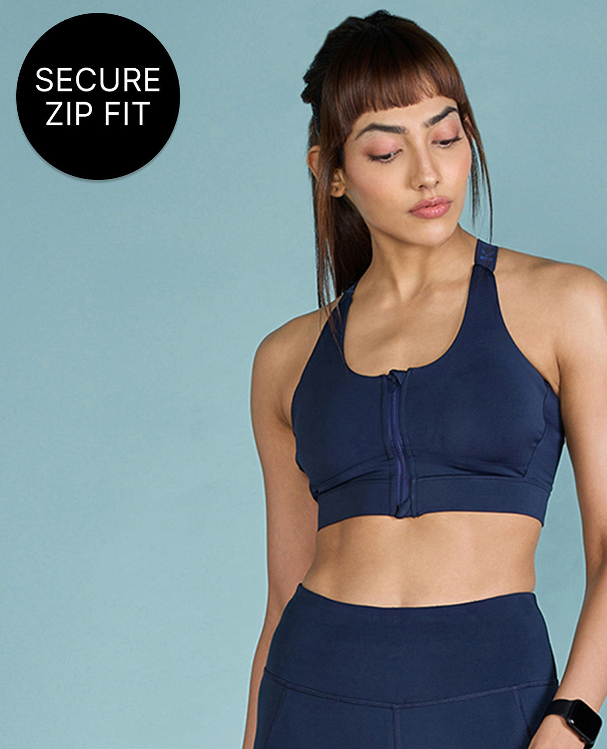 "The Front-Zip Mid-Impact Sports Bra is your new go-to sport bra for women, built for functionality, support, and style. Made in our signature Second SKN fabric with a breathable mesh racerback, this zip sports bra keeps you cool, dry, and confident through every move. Why you’ll love it: * Effortless wear: Front zip makes putting on and taking off your sports bra easy, even after sweaty sessions * Secure fit: Added clip provides extra support and keeps everything in place * Breathable style: Mesh racerback promotes airflow and keeps you sweat-free * Custom comfort: Removable pads let you wear it your way * Medium-impact support: Perfect for strength training, cardio, and dance flow Crafted in our durable Second SKN fabric (88% Polyester, 12% Spandex), this medium-impact sports bra for women delivers stretch, smoothness, and long-lasting performance. From studio sessions to gym workouts, this zip sports bra for women is your go-to for support, comfort, and style that moves with you."