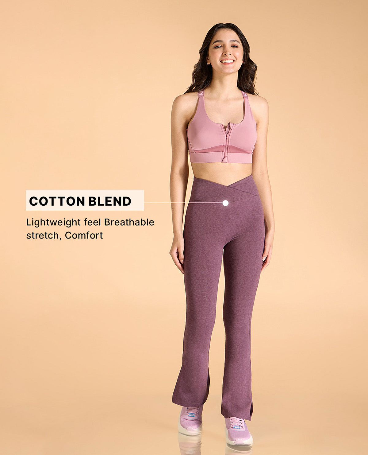 The Fan Favorite Criss-Cross Cotton Flares Pants Twirl, stretch, and slay in our Criss Cross Cotton Flare Pants, the ultimate fusion of comfort and chic style. These mid-rise flare pants for women are crafted from a soft, brushed cotton-blend fabric with the perfect hint of stretch, making them the ideal lounge pants or casual pants for everyday wear. The innovative design features a flattering criss-cross waistband that gently cinches your middle, ensuring a sleek silhouette. Whether you need comfy gym pants for women, stylish yoga pants, or the perfect athleisure piece for brunch, the soft feel, versatile support, and functional details make these one of the best rated pairs of flared pants available. Why You’ll Love Them: - Flattering Fit: The signature criss-cross waistband cinches your waist for a sleek, sculpted look, elevating these beyond basic women's workout pants. - Move With Ease: The comfortable mid-rise cut and ultra-soft, stretchy cotton blend let you twist, turn, and lounge without restriction. - Chic Details: A stylish side slit at the ankle adds flair and movement, while a subtle back coin pocket offers functional convenience. - Versatile Wear: The perfect all-day essential, transitioning effortlessly from gym sessions and yoga to weekend casual vibes and athleisure looks. Pair It With: Style it with QuickDry Stride Tops & Tanks or CourtCulture cotton tees—your perfect breathable workout duo.