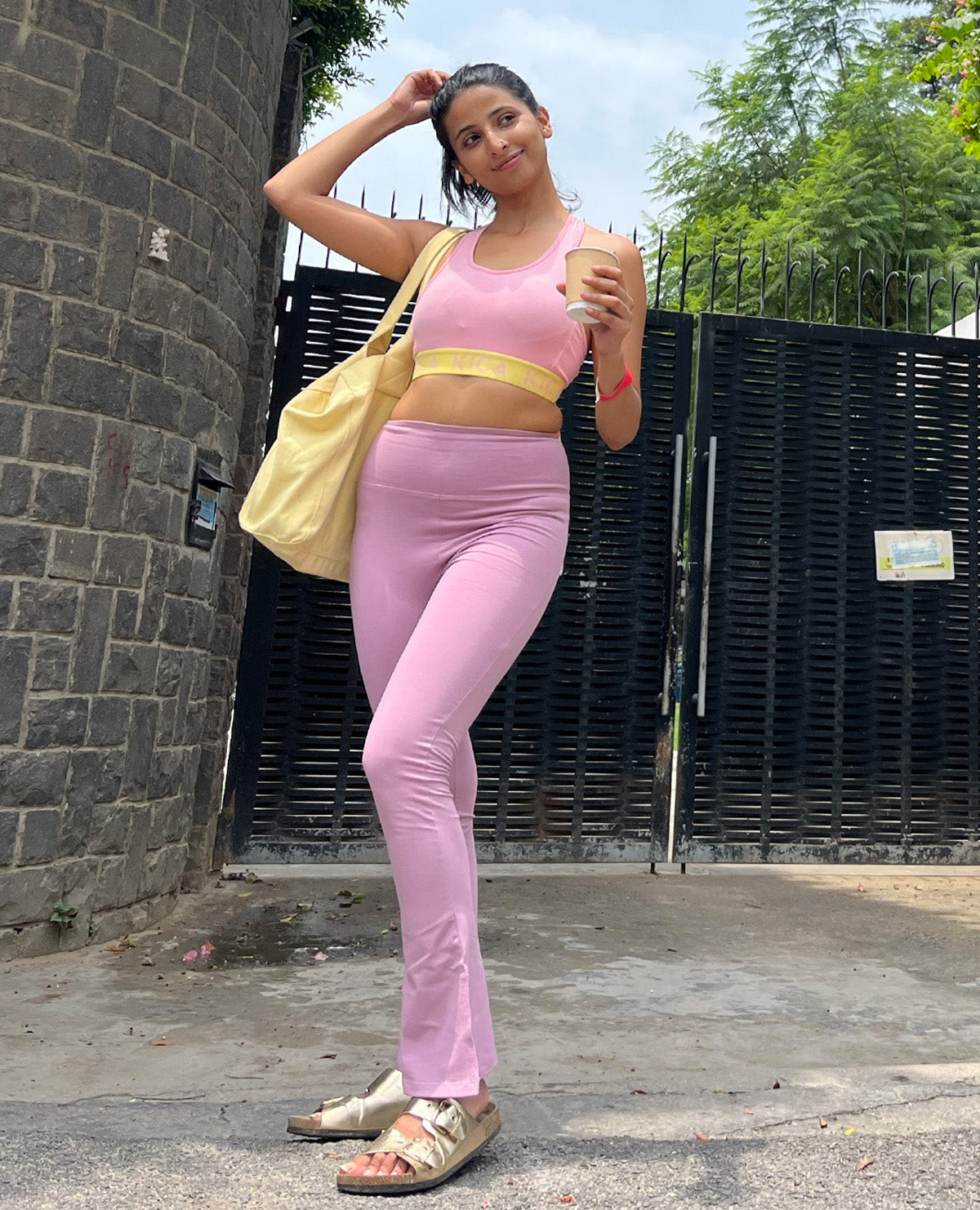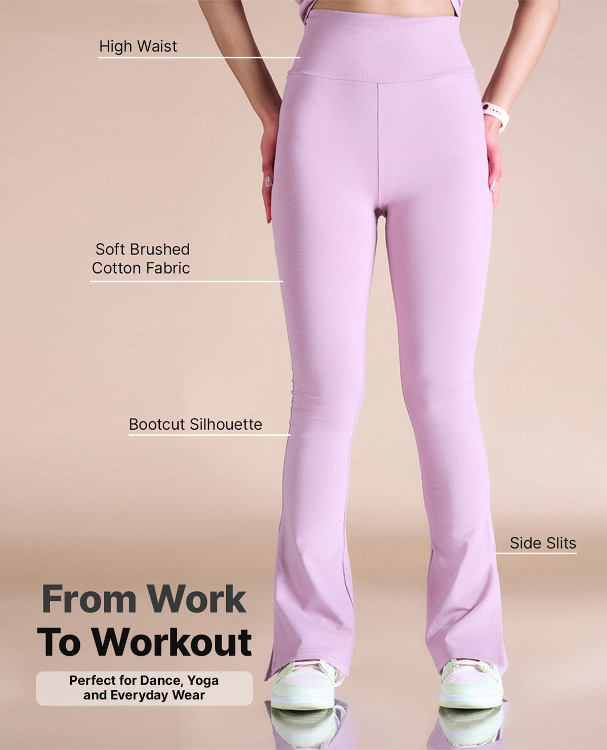 A: Our Flare Pants come in two fabric options: Second SKN fabric, known for its moisture-wicking and quick-drying properties, and a cotton+lycra blend for a soft and comfortable feel.