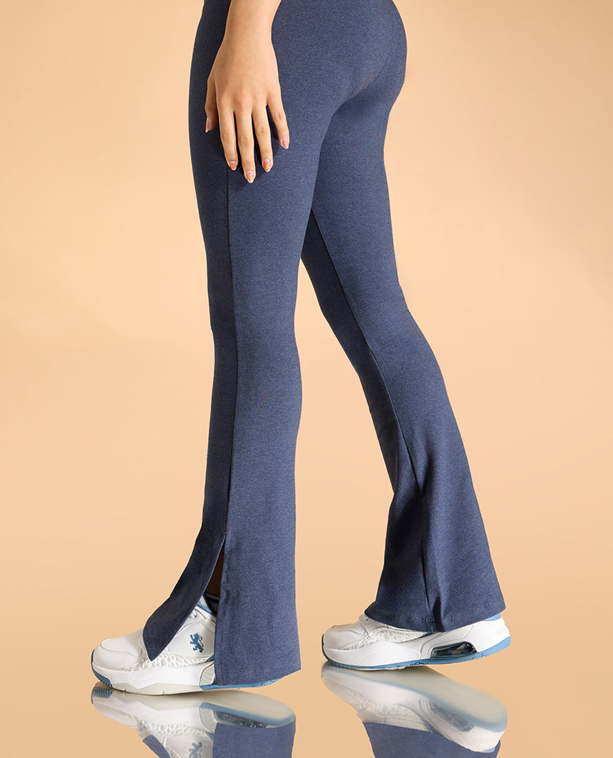 A: Our Flare Pants come in two fabric options: Second SKN fabric, known for its moisture-wicking and quick-drying properties, and a cotton+lycra blend for a soft and comfortable feel.