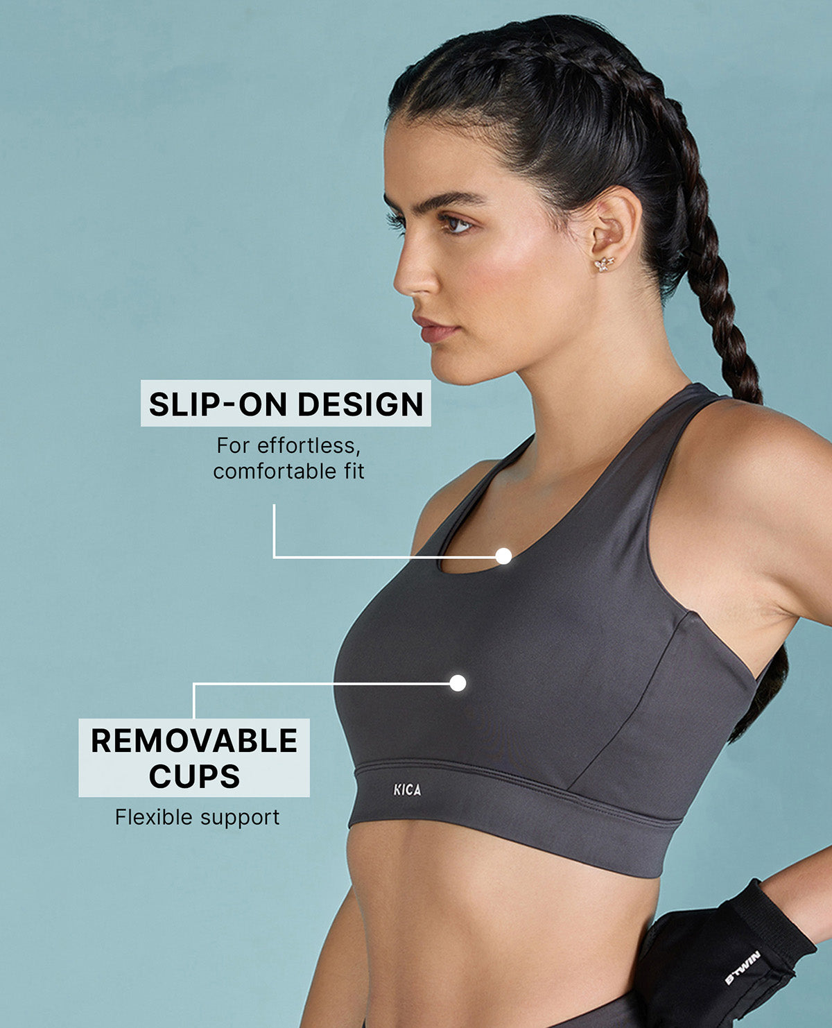 A: Kica sports bras are designed with features to ensure maximum support and comfort. Look for adjustable straps that allow you to customize the fit and find the right level of support for your body. Wide, padded shoulder straps help distribute weight and reduce pressure on your shoulders. Our sports bras also feature a supportive underband and encapsulated cups for excellent support and shape. Additionally, moisture-wicking and breathable fabrics are incorporated to keep you cool and dry during your workouts.