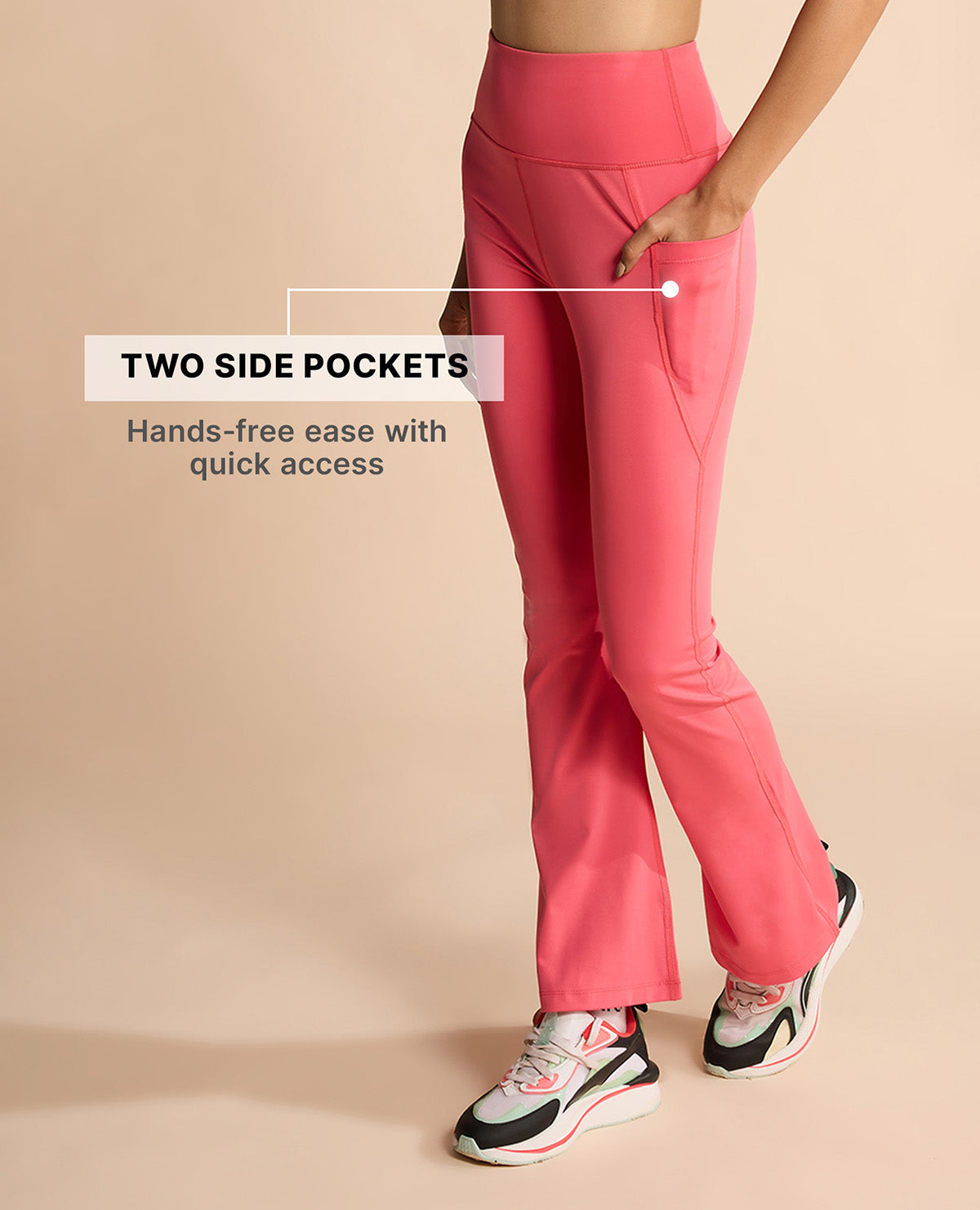 "Meet our bestselling Flare Pants for women, crafted in the cult-favourite Second SKN fabric that hugs your curves, shapes beautifully, and feels like a second skin. Breathable, quick-drying, and completely opaque, these women’s flare yoga pants are built to move with you, sweat-free. Why you’ll love them: * Stay-put fit: High-rise waistband that doesn’t roll or slip, even during your deepest squats. * All-day comfort: Soft elastic sits smoothly at your waist, no digging, no marks. * Zero awkward moments: Anti-camel toe and squat-proof construction keep you confident at the gym. * Flattering by design: Bootcut silhouette that elongates your legs and lifts your curves. * Functional details: Two side pockets to stash your essentials while you’re on the move. Made in our signature Second SKN blend (88% Polyester, 12% Elastane) for a snug-yet-stretchy fit, these flare leggings for women work as hard as you do. From work to workout to weekend plans, the Flare Pants are your versatile, all-day-anywhere essential, the perfect pair of stylish yoga pants for women."