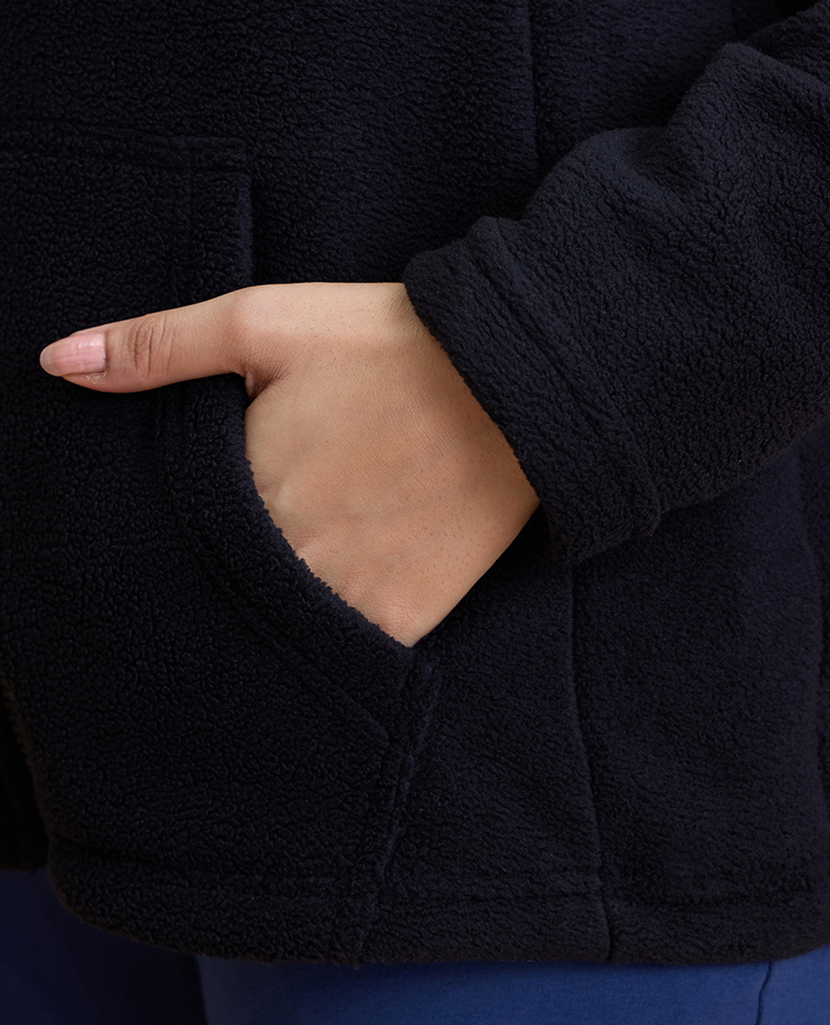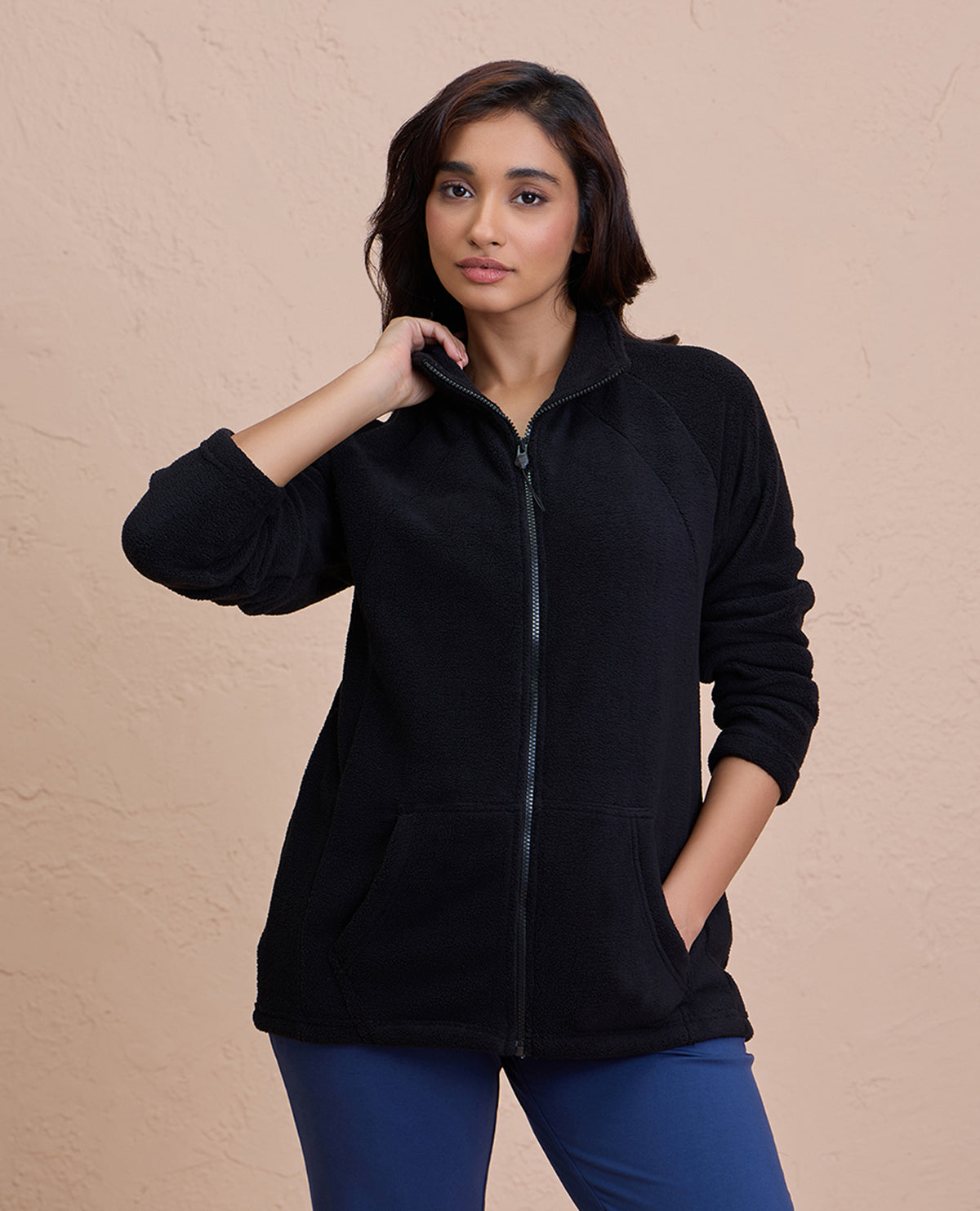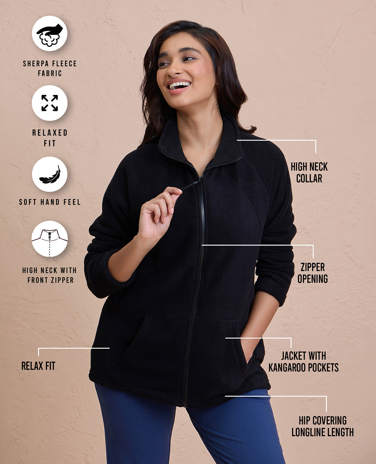 This Sherpa jacket is the definition of cozy. It comes in relaxed fit with standing collar and kangaroo pockets to keep you warm and snug.