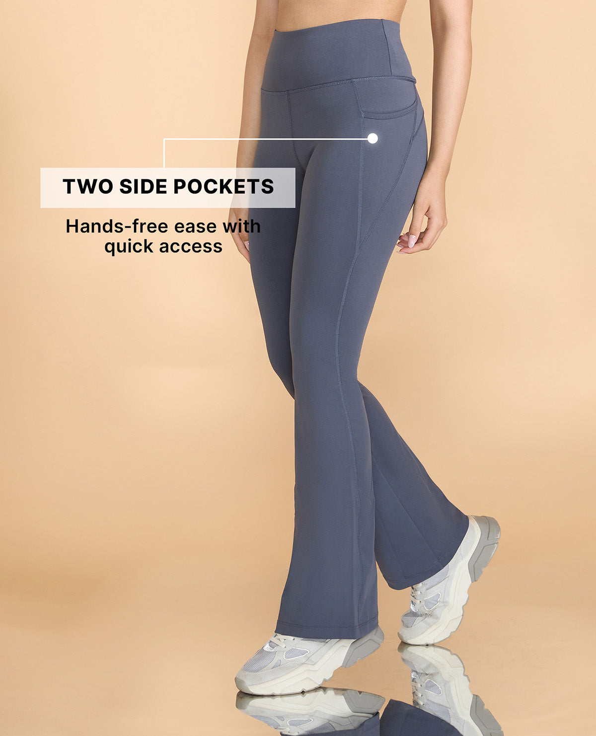 "Meet our bestselling Flare Pants for women, crafted in the cult-favourite Second SKN fabric that hugs your curves, shapes beautifully, and feels like a second skin. Breathable, quick-drying, and completely opaque, these women’s flare yoga pants are built to move with you, sweat-free. Why you’ll love them: * Stay-put fit: High-rise waistband that doesn’t roll or slip, even during your deepest squats. * All-day comfort: Soft elastic sits smoothly at your waist, no digging, no marks. * Zero awkward moments: Anti-camel toe and squat-proof construction keep you confident at the gym. * Flattering by design: Bootcut silhouette that elongates your legs and lifts your curves. * Functional details: Two side pockets to stash your essentials while you’re on the move. Made in our signature Second SKN blend (88% Polyester, 12% Elastane) for a snug-yet-stretchy fit, these flare leggings for women work as hard as you do. From work to workout to weekend plans, the Flare Pants are your versatile, all-day-anywhere essential, the perfect pair of stylish yoga pants for women."
