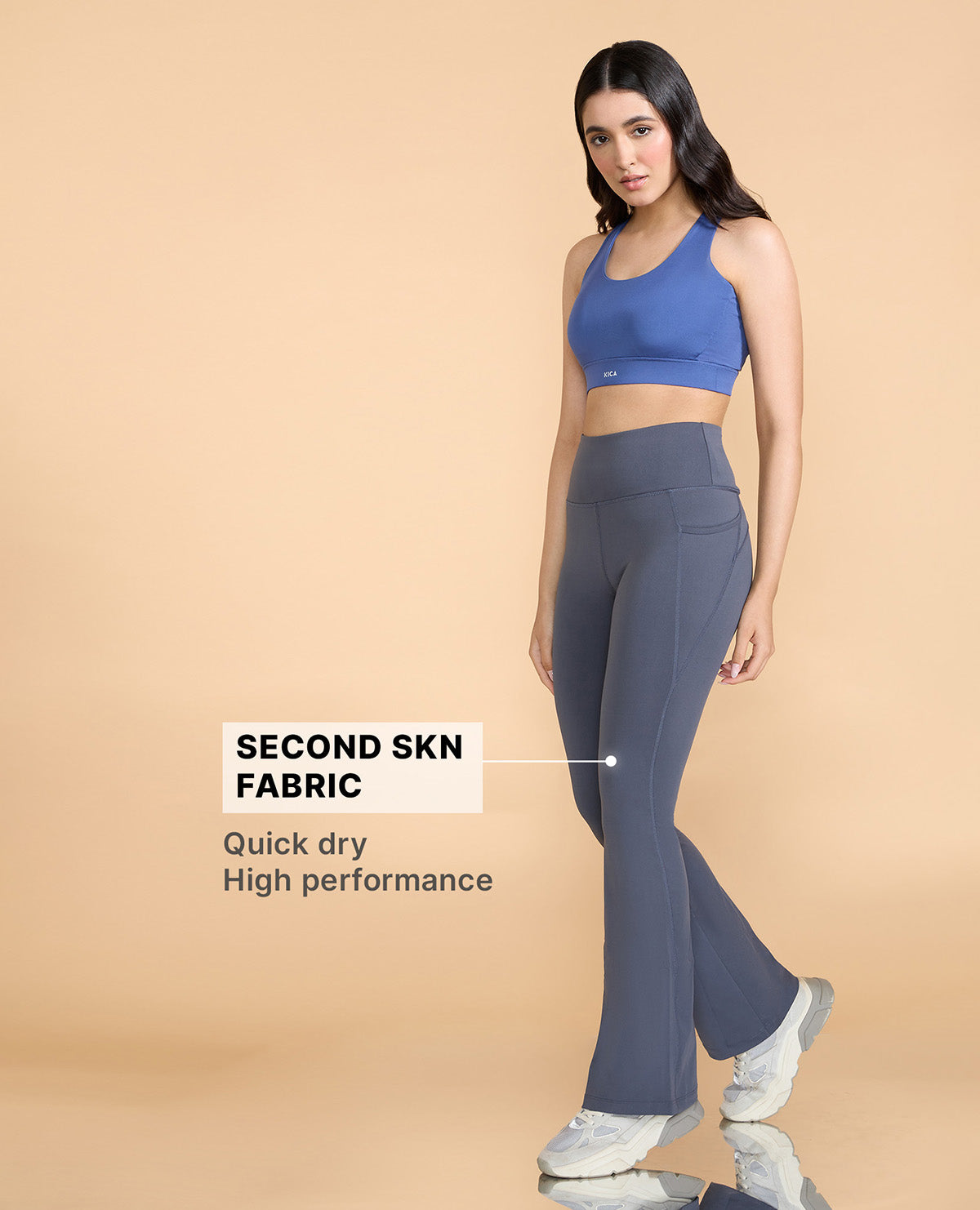 A: Our Flare Pants come in two fabric options: Second SKN fabric, known for its moisture-wicking and quick-drying properties, and a cotton+lycra blend for a soft and comfortable feel.