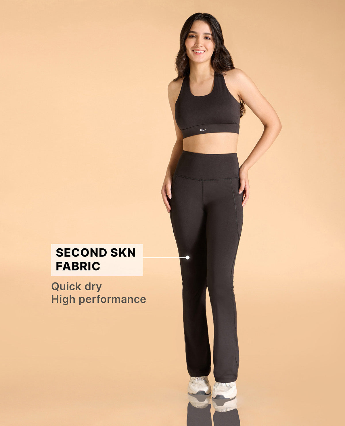 A: Our Flare Pants come in two fabric options: Second SKN fabric, known for its moisture-wicking and quick-drying properties, and a cotton+lycra blend for a soft and comfortable feel.