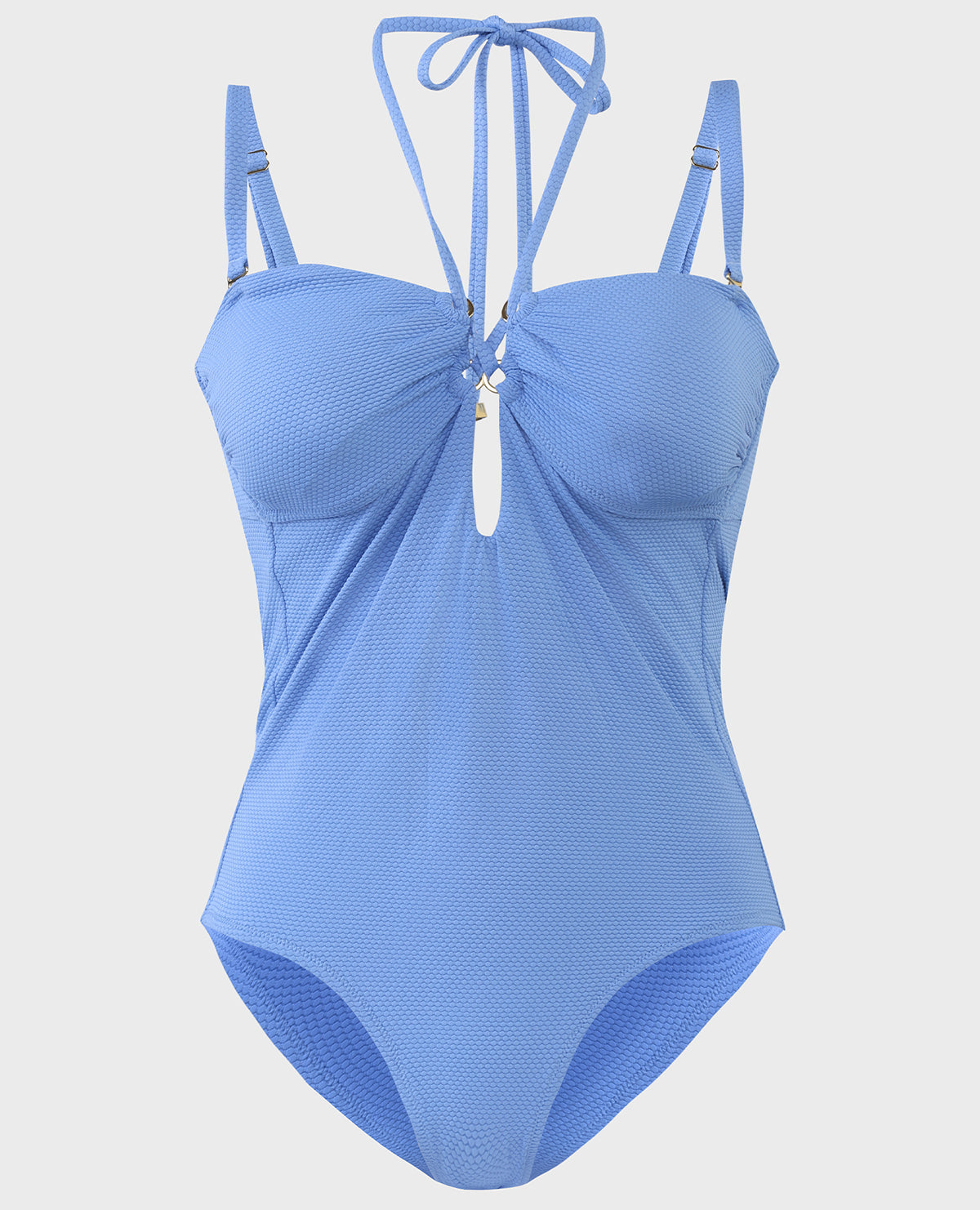 Introducing our stylish swimsuit, designed to capture the essence of the coast! Made from a special textured fabric, it boasts a trendy tie-up neckline and a stylish center cut-out. You can wear it with or without the straps, thanks to its versatility. The deep back cut-out and rear tie-ups ensure a flattering look for all body types. Plus, it comes with removable cups for added support. Whether you're chilling by the pool or exploring the beach, feel confident and stylish in every move with our chic tir up detail swimsuit!