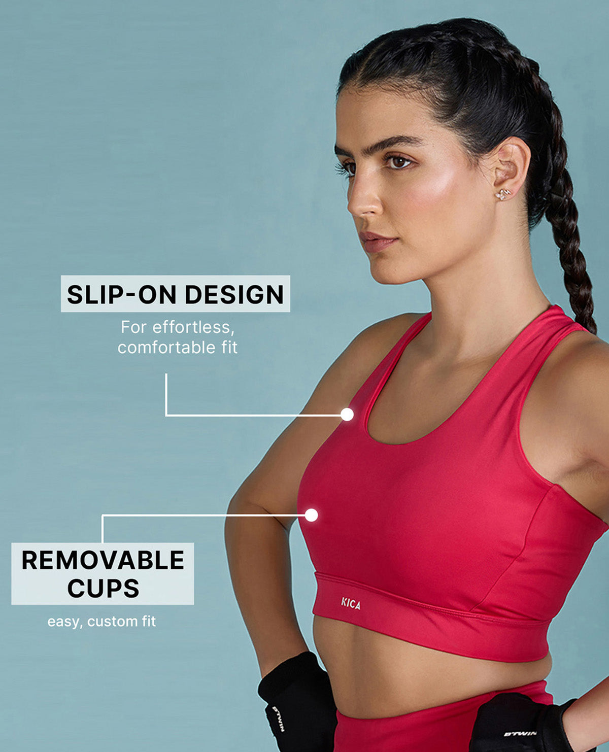 A: Kica sports bras are designed with features to ensure maximum support and comfort. Look for adjustable straps that allow you to customize the fit and find the right level of support for your body. Wide, padded shoulder straps help distribute weight and reduce pressure on your shoulders. Our sports bras also feature a supportive underband and encapsulated cups for excellent support and shape. Additionally, moisture-wicking and breathable fabrics are incorporated to keep you cool and dry during your workouts.