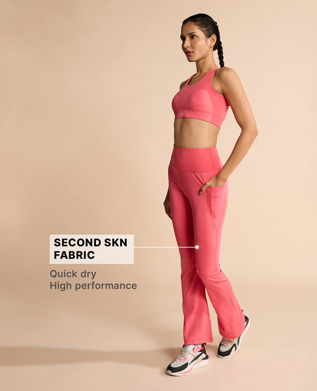 "Meet our bestselling Flare Pants for women, crafted in the cult-favourite Second SKN fabric that hugs your curves, shapes beautifully, and feels like a second skin. Breathable, quick-drying, and completely opaque, these women’s flare yoga pants are built to move with you, sweat-free. Why you’ll love them: * Stay-put fit: High-rise waistband that doesn’t roll or slip, even during your deepest squats. * All-day comfort: Soft elastic sits smoothly at your waist, no digging, no marks. * Zero awkward moments: Anti-camel toe and squat-proof construction keep you confident at the gym. * Flattering by design: Bootcut silhouette that elongates your legs and lifts your curves. * Functional details: Two side pockets to stash your essentials while you’re on the move. Made in our signature Second SKN blend (88% Polyester, 12% Elastane) for a snug-yet-stretchy fit, these flare leggings for women work as hard as you do. From work to workout to weekend plans, the Flare Pants are your versatile, all-day-anywhere essential, the perfect pair of stylish yoga pants for women."